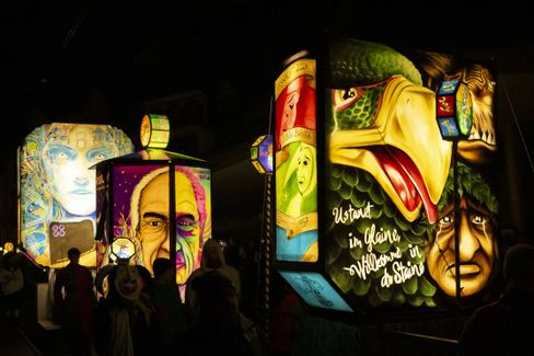 Bilder von Laternen bei der Basler Fasnacht, die durch die Nacht gezogen werden. Die Laternen sind von innen beleuchtet und erstrahlen in bunten Farben.