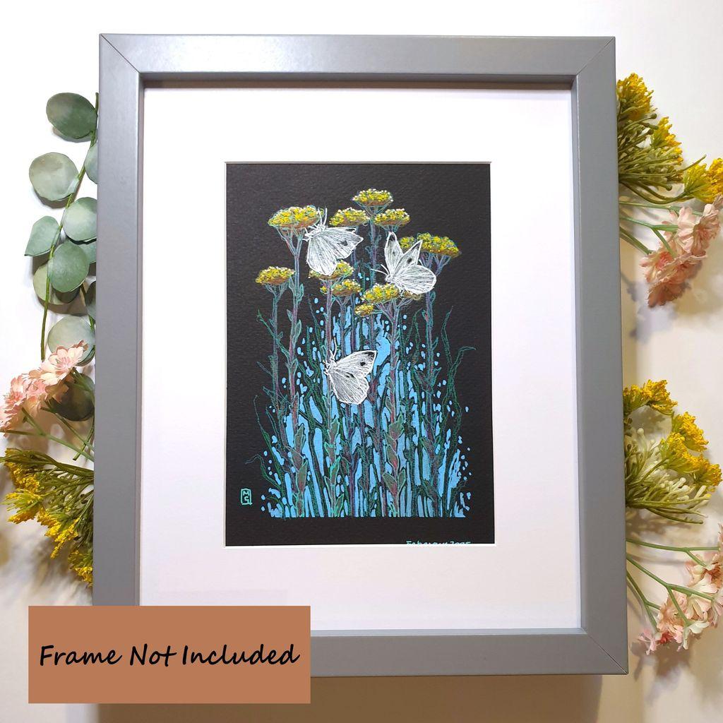 A small illustrative style drawing of three cabbage white butterflies on yellow flowers. Now reduced to just £22.50. That's a great price for original art!