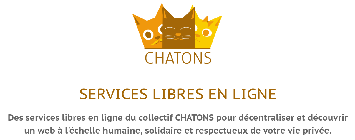 Des services libres en ligne du collectif CHATONS pour décentraliser et découvrir un web à l'échelle humaine, solidaire et respectueux de votre vie privée."