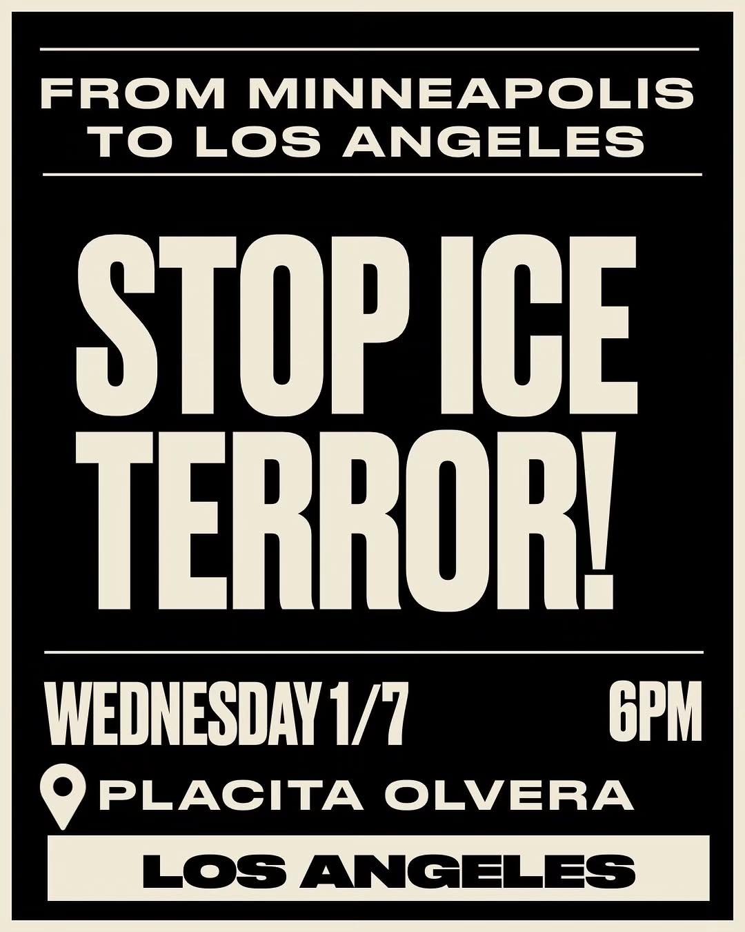 From Minneapolis to Los Angeles stop ICE terror. Wednesday 1/7 6 PM. Placita Olvera, Los Angeles.
