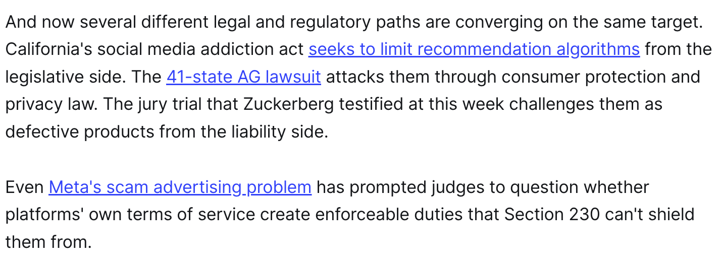 The social media trial underway in LA is only one of the major challenges to Section 230 that has recently gained traction. It really feels like a dam is about to break https://www.platformer.news/the-infinite-scroll-goes-on-trial/
