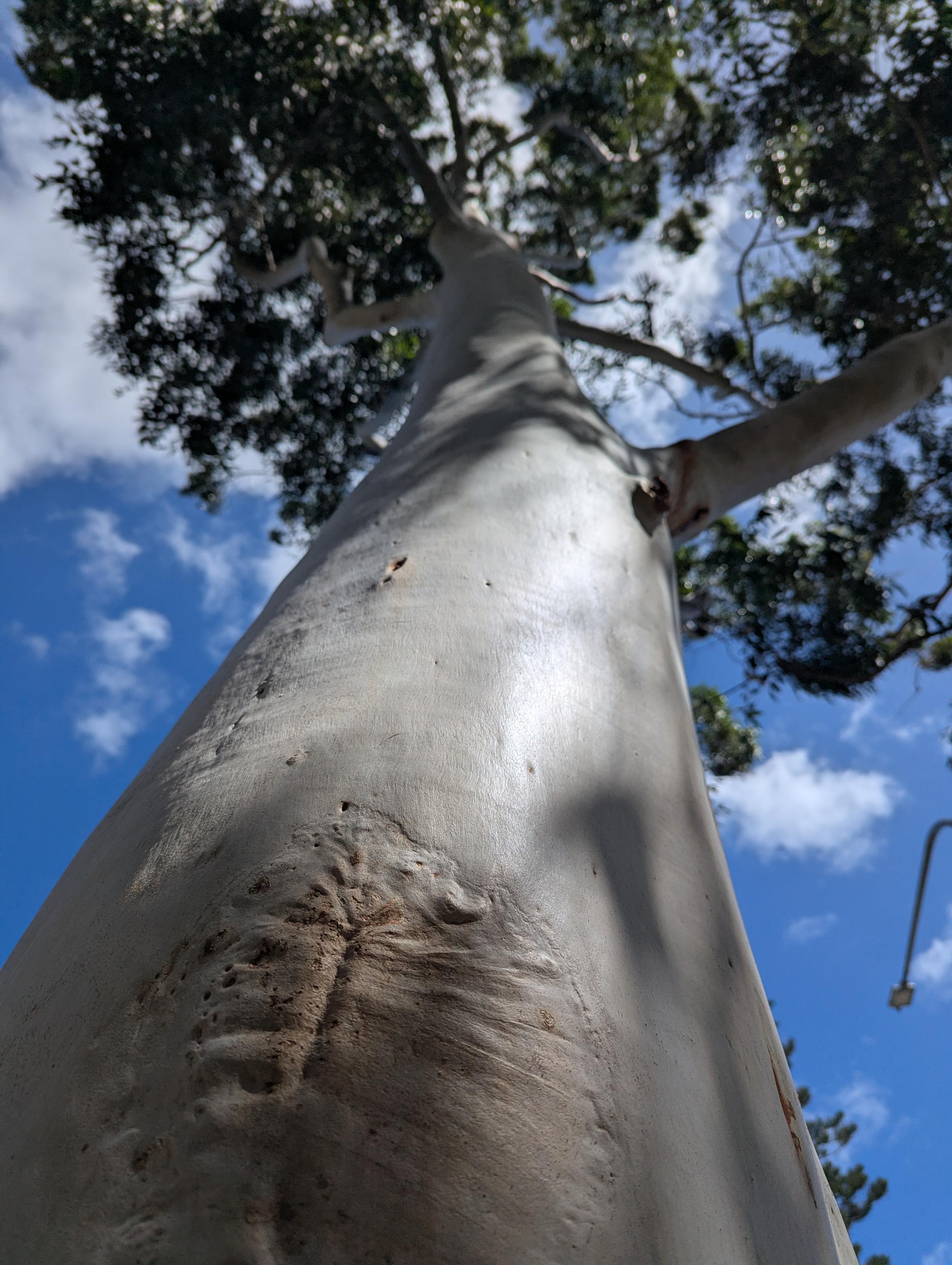 alt Tall shiny eucalypt tree in late afternoon sunlight with a mark on its trunk that looks peculiar Tall shiny eucalypt tree in late afternoon sunlight with a mark on its trunk that looks peculiar