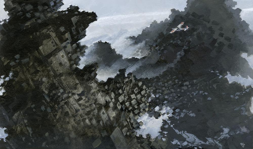 Tilted perspective of a tiny plane flying over a dark range of mountains. The composition is heavier on the left with snow infiltrating on the right where the odd cubic shapes eventually give way to an expanse of white that stretches to the horizon. The plane is odd in that the engine is mounted behind the fixed wing.