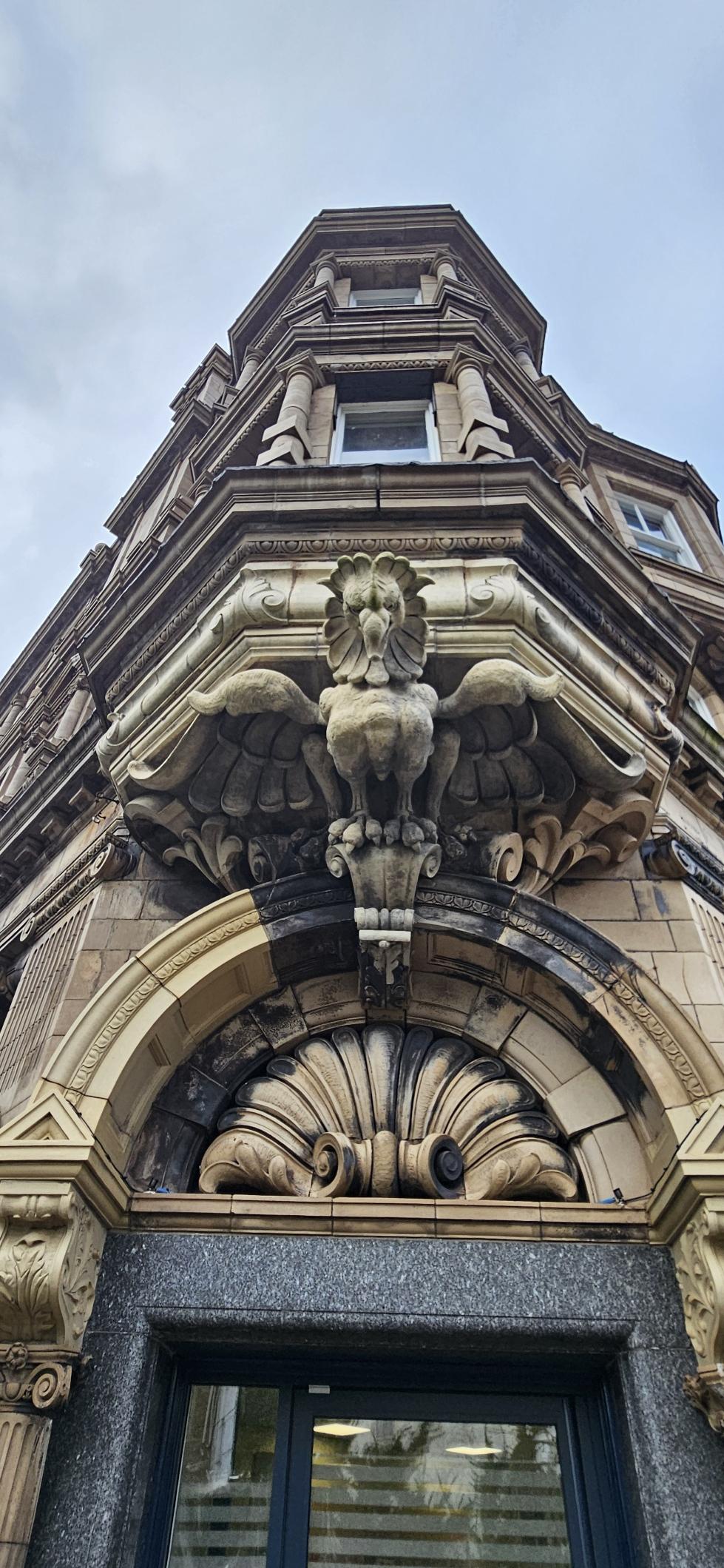 We saw this fabulously decorated building in #Caernarfon today with a sumptuously carved #griffin over the front door, wings outstretched.