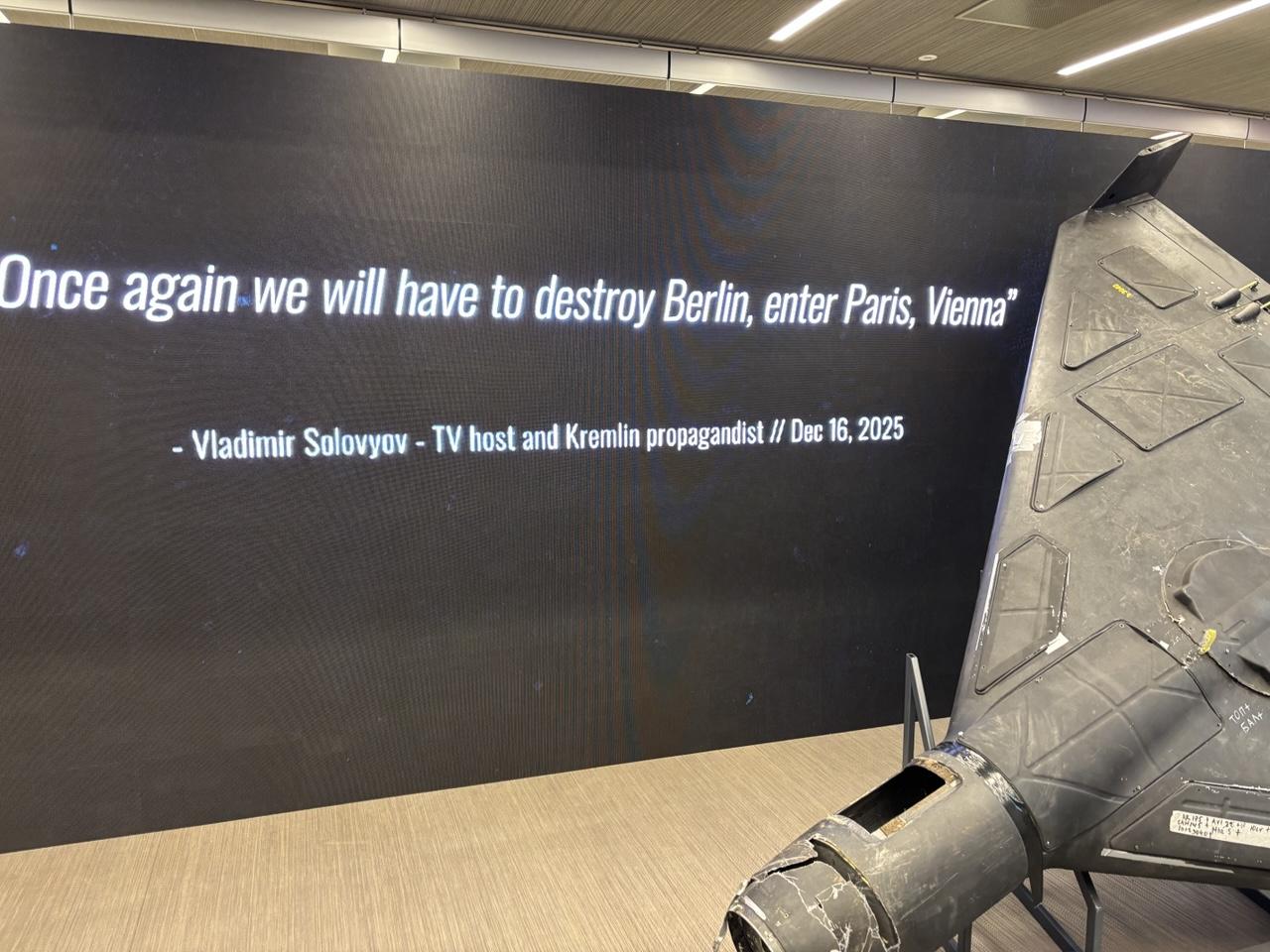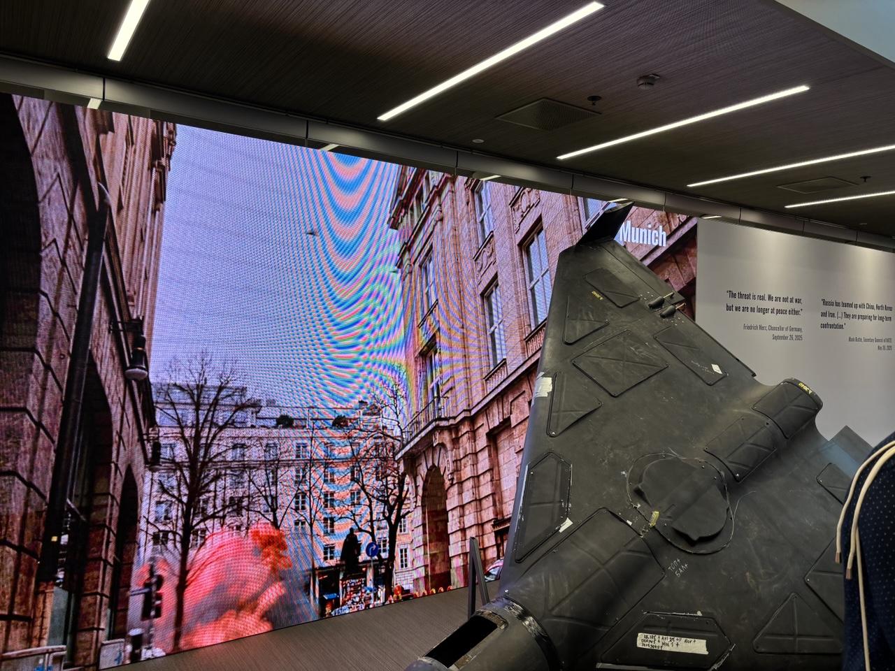 Russian Shahed drone in the Ukrainian house. Behind it, there is a video showing drone attacks on Munich, Vienna and other European cities.