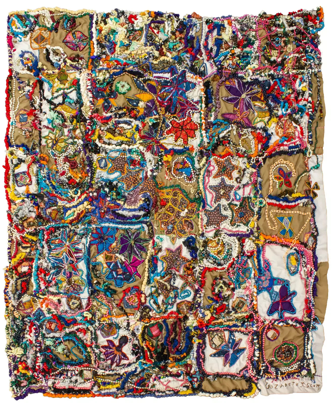 Elizabeth Talford Scott (1916-2011) learned quilting from both parents growing up in South Carolina. After a career as a domestic worker, she expanded on those childhood lessons, developing a unique, mixed media style. Later in life, she often partnered with her daughter, artist Dr. Joyce Scott, on collaborations