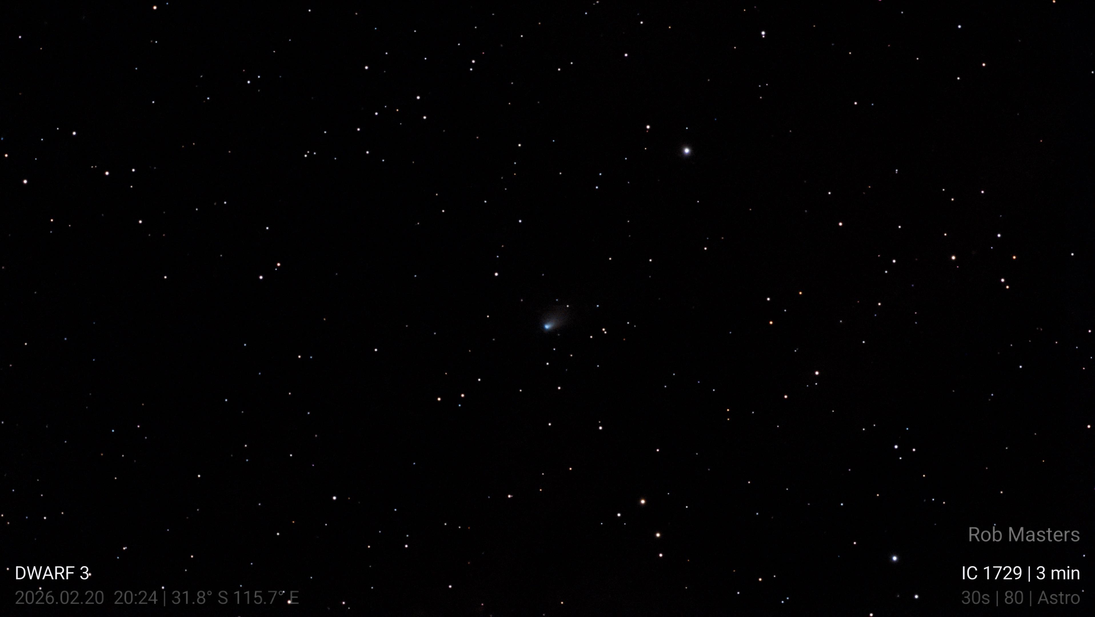 alt A simple star field, with a pale blue comet in the centre, a short diffuse tail stretching up to the right. In the lower corners are technical details of the shot, which are in the body of the post. A simple star field, with a pale blue comet in the centre, a short diffuse tail stretching up to the right. In the lower corners are technical details of the shot, which are in the body of the post.