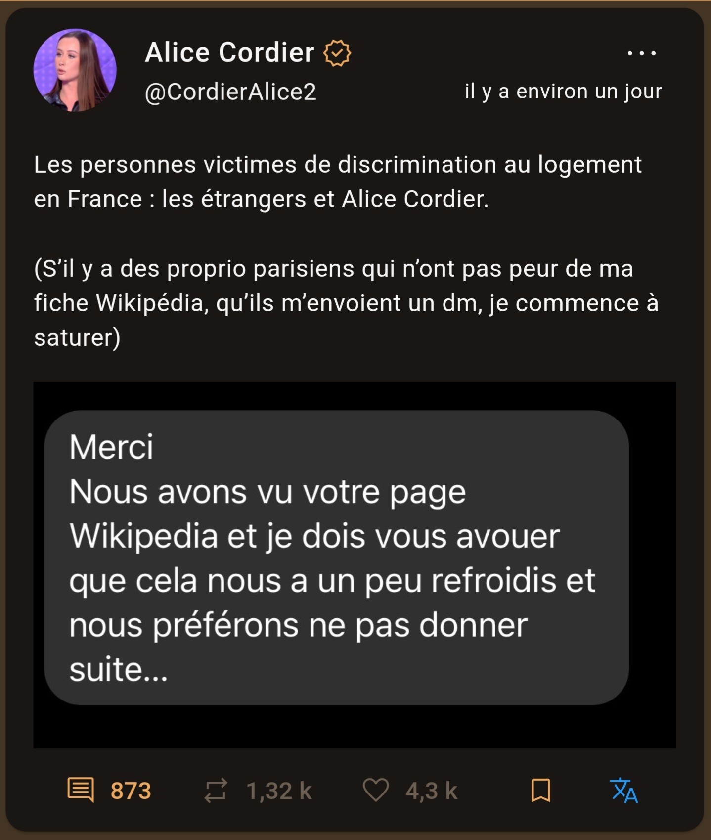Alice Cordier sur Twitter : « Les personnes victimes de discrimination au logement en France : les étrangers et Alice Cordier. (S’il y a des proprio parisiens qui n’ont pas peur de ma fiche Wikipédia, qu’ils m’envoient un dm, je commence à saturer). En dessous,une réponse qui lui a été envoyée : « Merci. nous avons vu votre page wikipedia et je dois vous avouer que cela nous a un peu refroidis et préférons ne pas donner suite… »