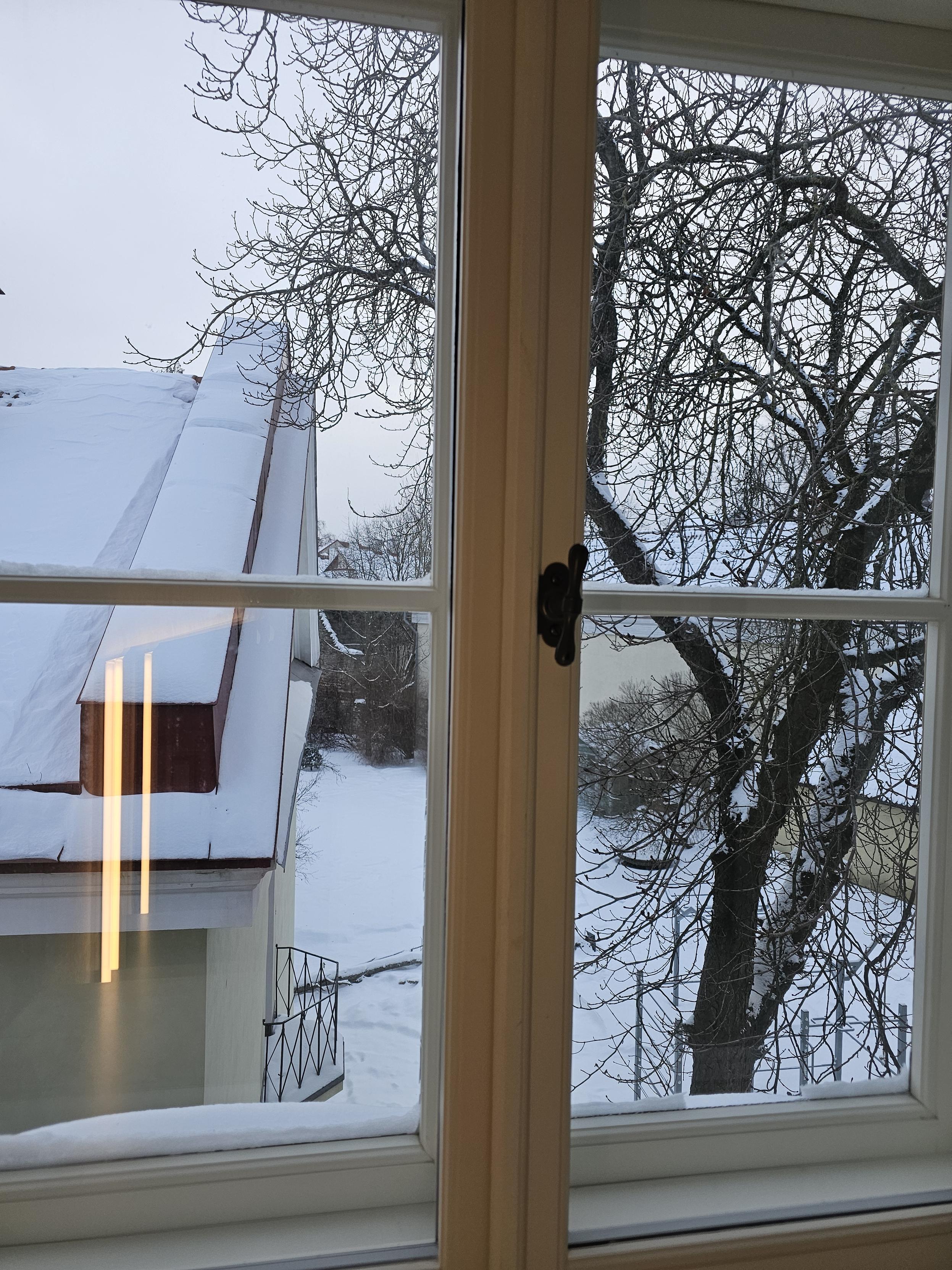 Ikkunan läpi otettu kuva jossa näkyy oikealla luminen puu ja sen takana valkea rakennus jossa lunta katolla. Vasemmalla näkyy vähän rakennuksen lumista kattoa. Taivas on valkoinen ja myös maassa on lunta.