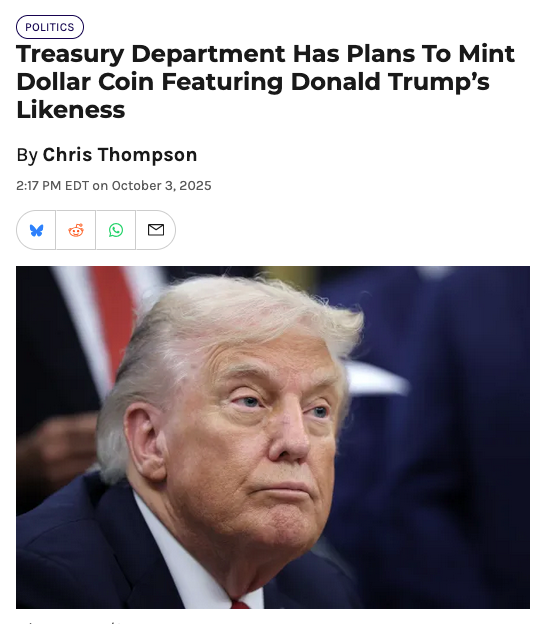 Helpfully, the Treasury Department has deleted a webpage that points out it's been against the law since 1866 to mint U.S. coins with a living person's picture on them.