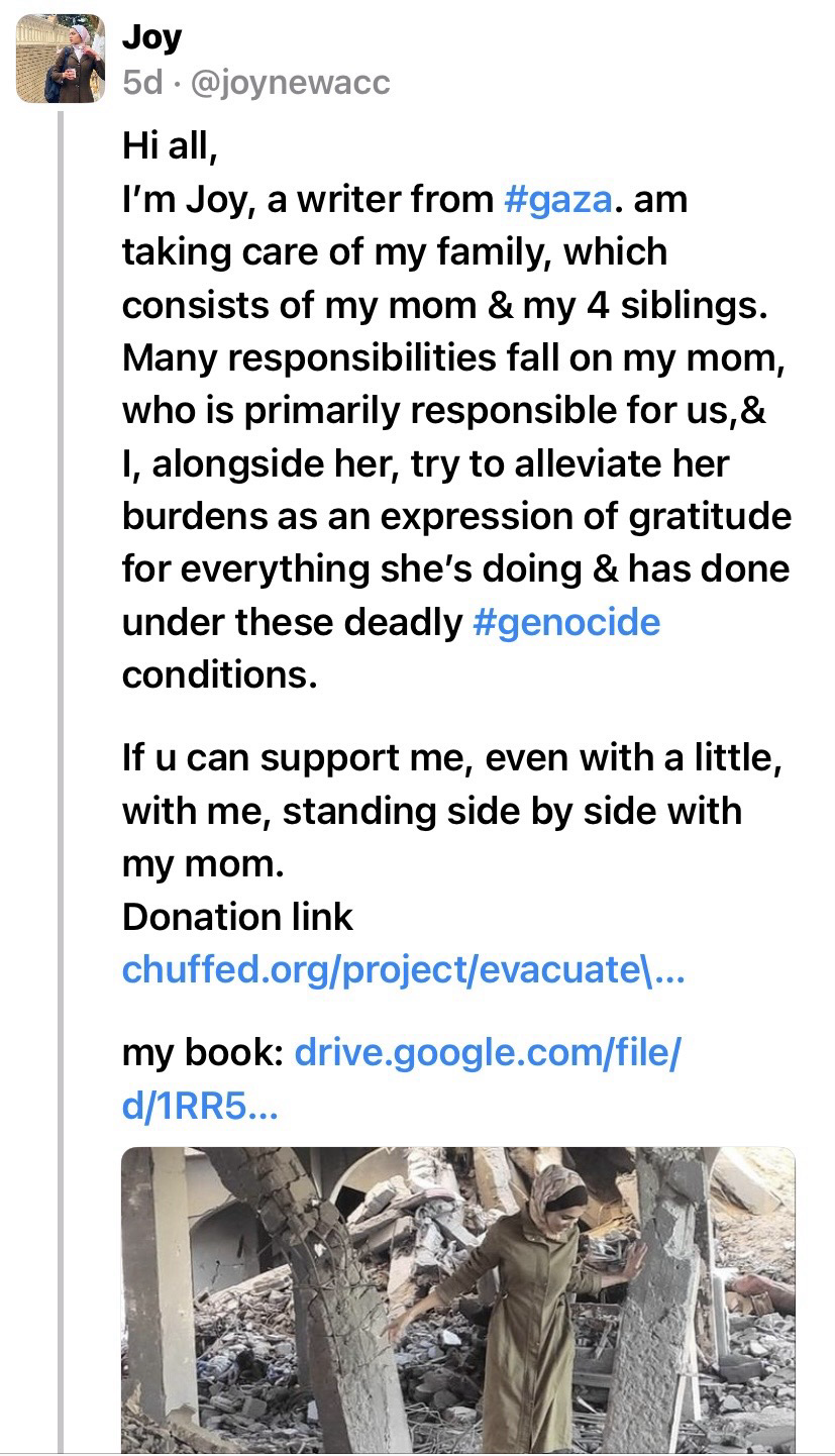 I’m Joy, a writer from #gaza. am taking care of my family, which consists of my mom & my 4 siblings.