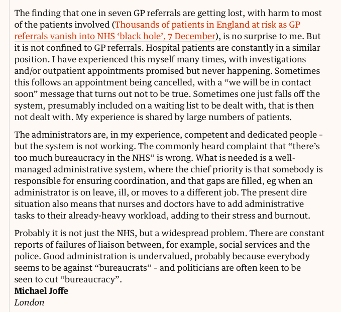 As Micheal Joffe, implies those who worry that the NHS is too bureaucratic (and therefore seek to cut non-medical staff) are conflating management with administration.... Indeed, one might conclude that there are too many managers & not enough administrators in the health service.... a problem that one would also find in the university sector!