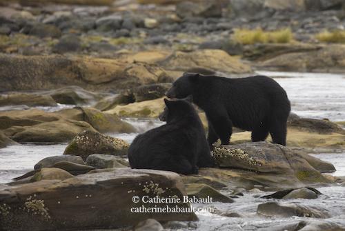 Deux ours noirs se partagent un bon coin pour attraper du saumon sur l'île de Vancouver en Colombie-Britannique.