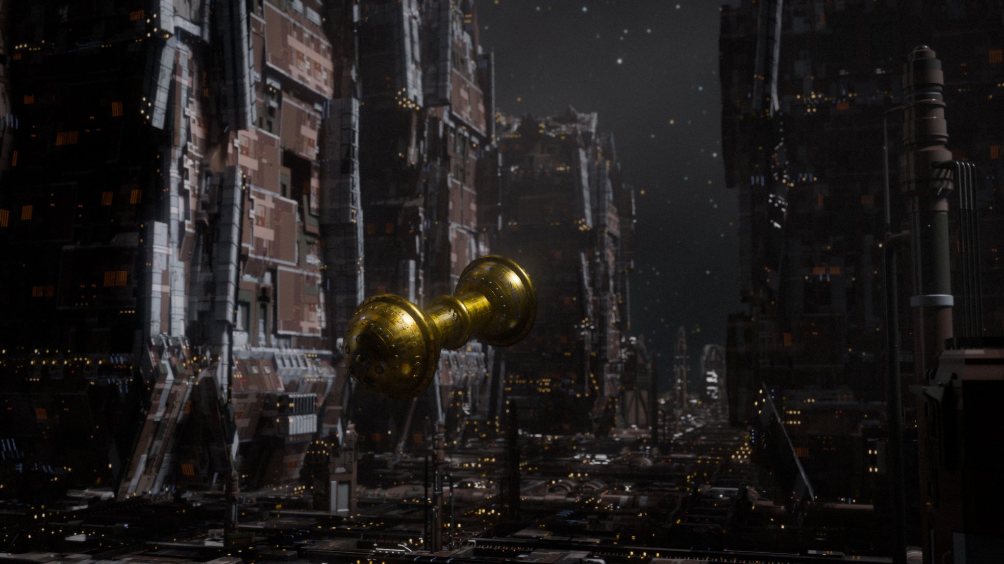 The SOL is one of the most famous spaceships from the german #PerryRhodan scifi series. The ship is a giant, 8000 meters long, it consists of three parts (the two spheres and the middle part) that can disconnect and operate on their own. Here the ship is depicted in a setting that might be a yard world of the Cosmocrats or the Chaotarchs, immensly advanced beings of the Perryverse. Please note that this is an artistic approach, not one that sticks very close to the descriptions of the ship.