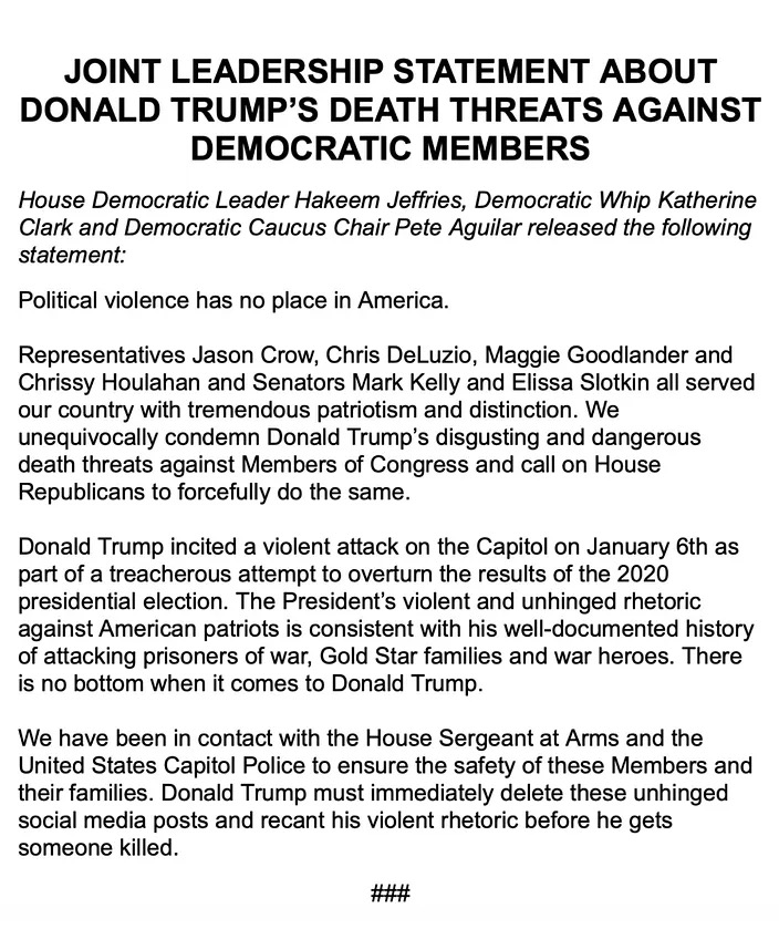 #House #Democratic Leader Hakeem Jeffries, Democratic Whip Katherine Clark & Democratic Caucus Chair Pete Aguilar released the following statement: