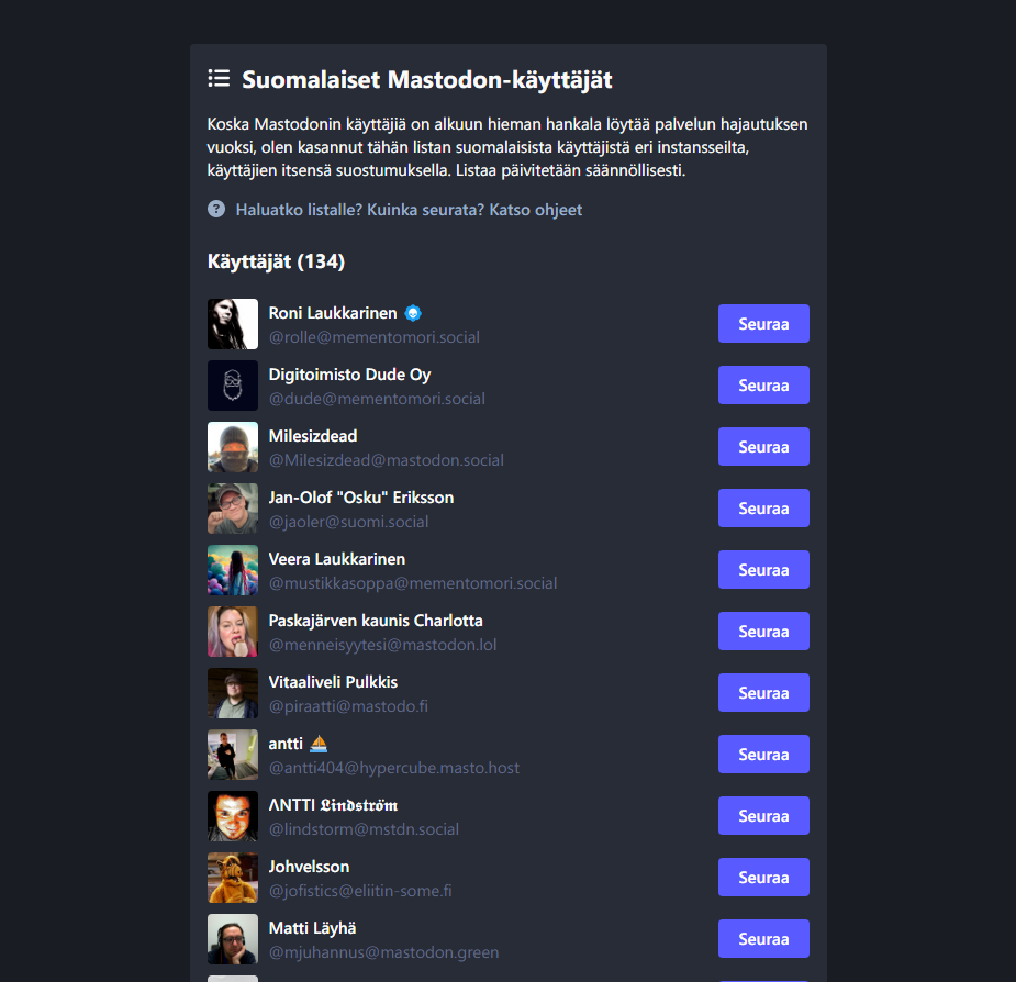 Lista löytyy osoitteesta https://mementomori.social/suomalaiset-mastodon-kayttajat