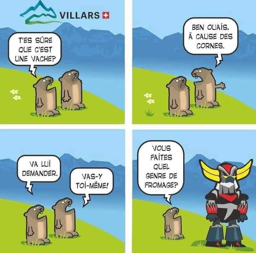 Deux marmottes regardent dans la même direction quelque chose au loin. L'une d'elle demande "tu es sur que c'est une vache ?". La seconde répond "Ben ouai a cause des cornes". La première dit "Va lui demander". La seconde réplique "Vas y toi même". La première marmotte s'exécute et demande a Goldorak "Vous faites quel genre de fromage ?"