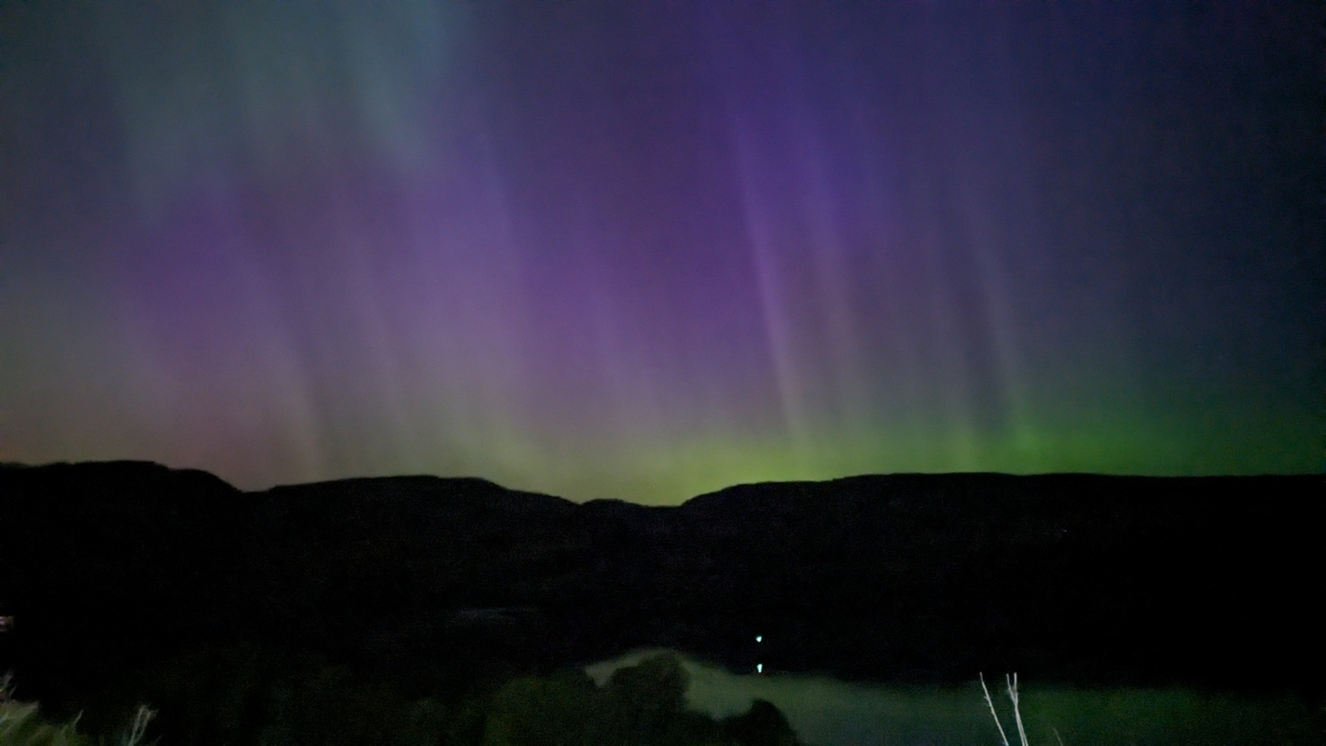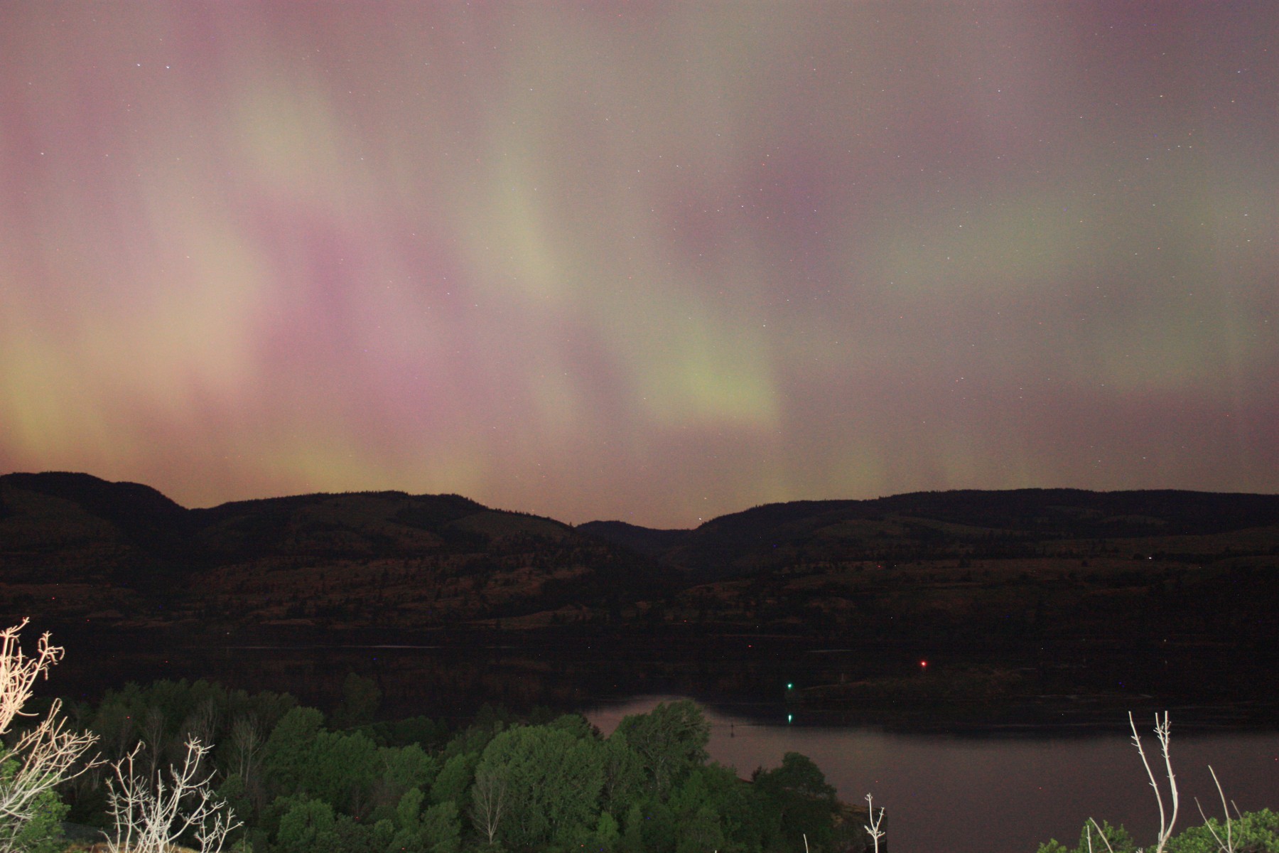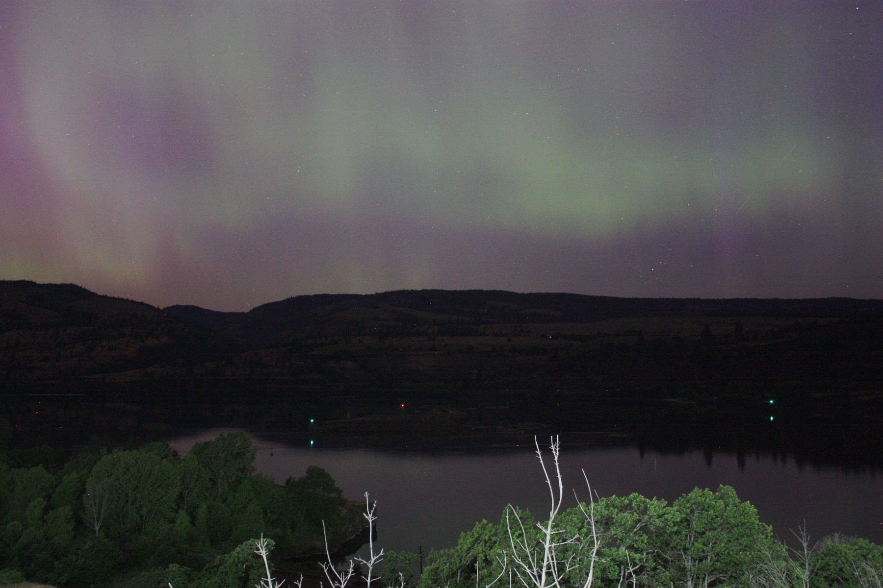 I got some more #AuroraBorealis pics overlooking the Columbia River near Mosier, Oregon. Mountains across the river are in Washington state. (edit: For scale, the Columbia River is 3/4mi or 1km wide at this point.) #astronomy #SpaceWeather