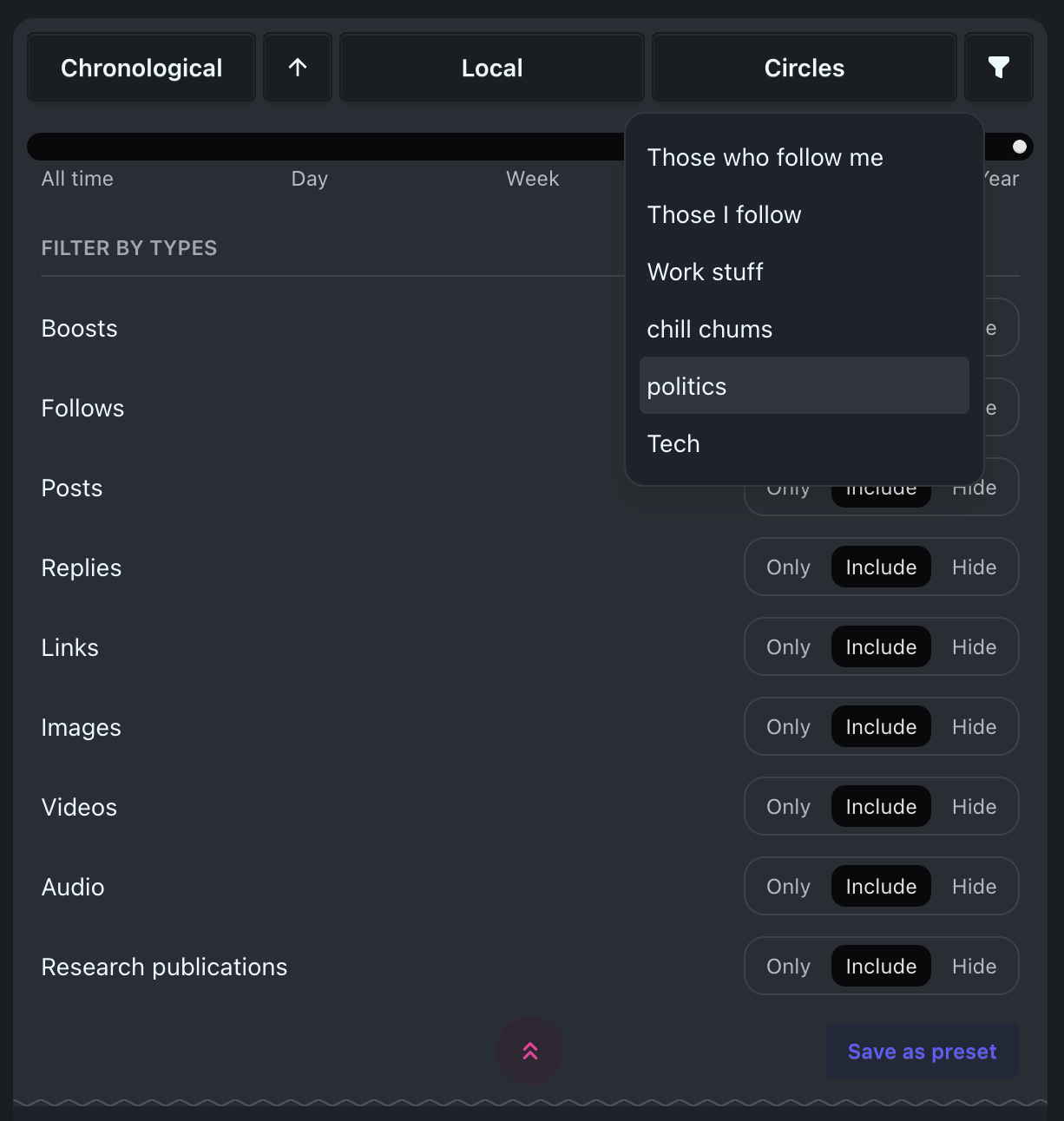 alt Screenshot of a filter UI in Bonfire, with a Circles dropdown containing a list of circles like: Those who follow me Those | follow Work stuff etc Screenshot of a filter UI in Bonfire, with a Circles dropdown containing a list of circles like: Those who follow me Those | follow Work stuff etc