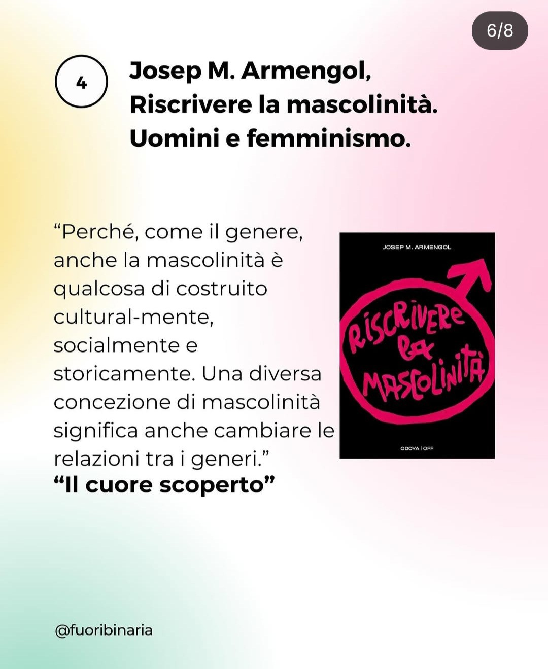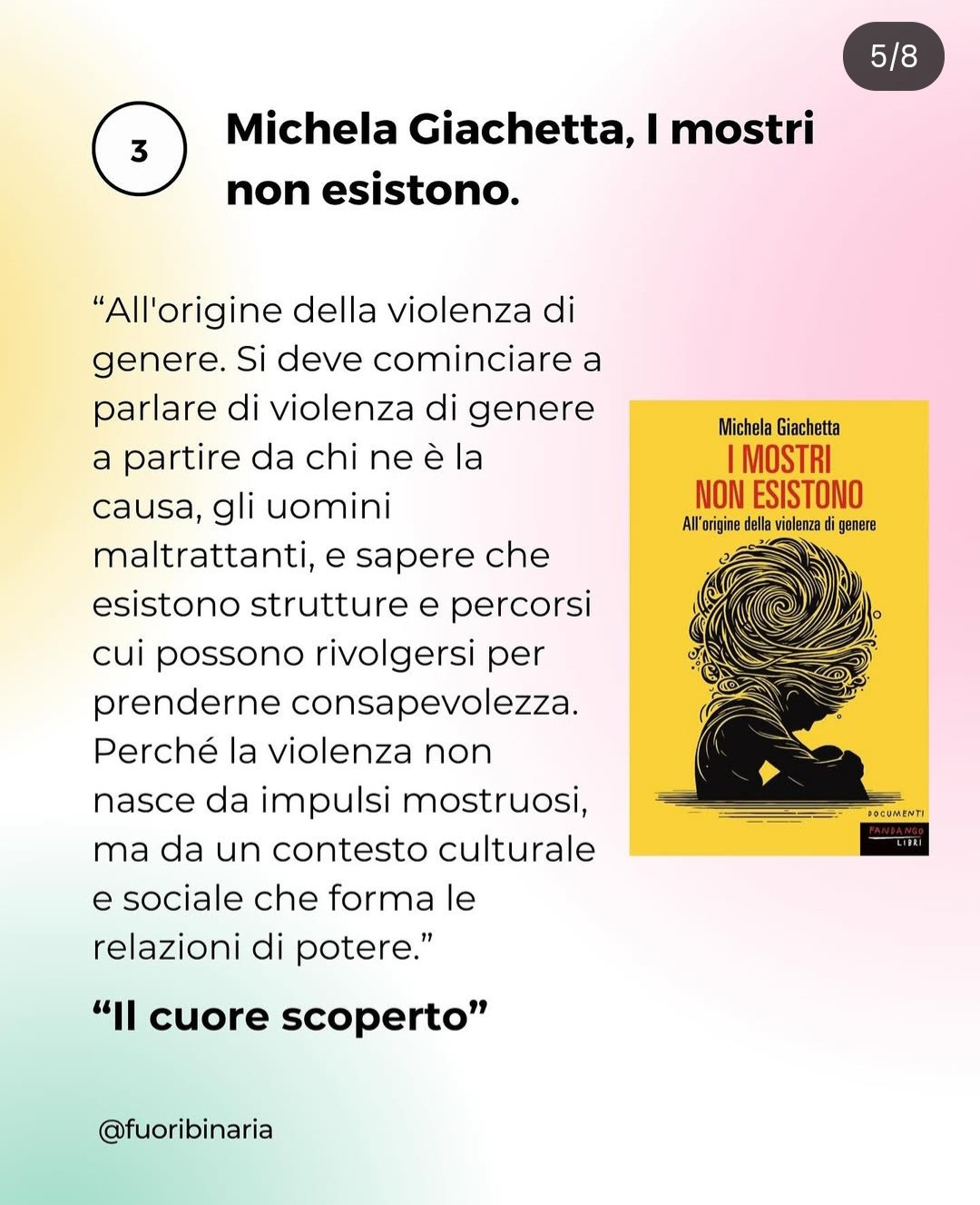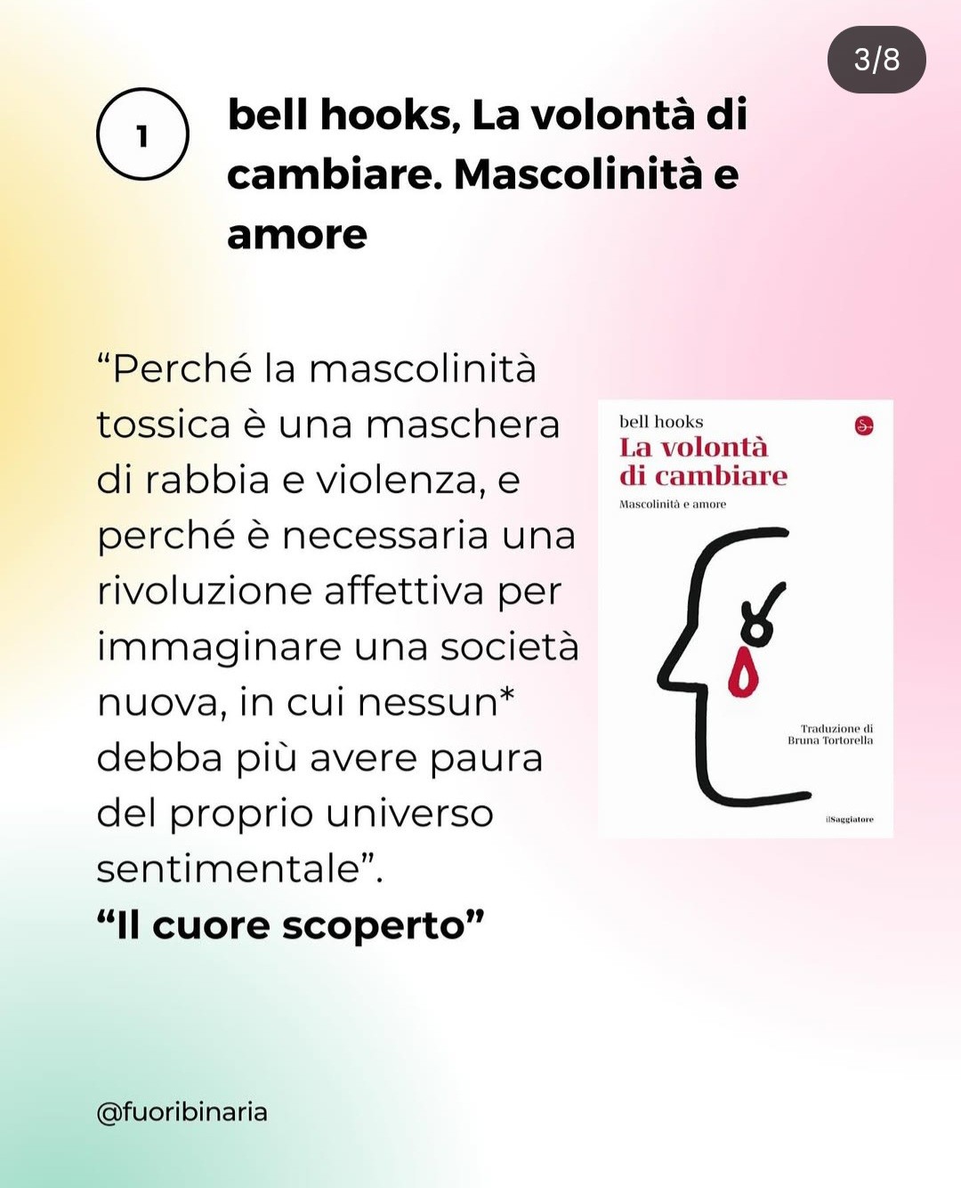 "stavamo scrivendo l'ennesima lista di libri in modo generico, per ridiscutere i termini dell'amore e delle relazioni, ci è venuto ancora una volta in aiuto il libro di Il cuore scoperto e abbiamo creato questo post di libri che possono leggere le persone socializzate come maschi, per iniziare a fare un percorso di decentrazione dell'amore"