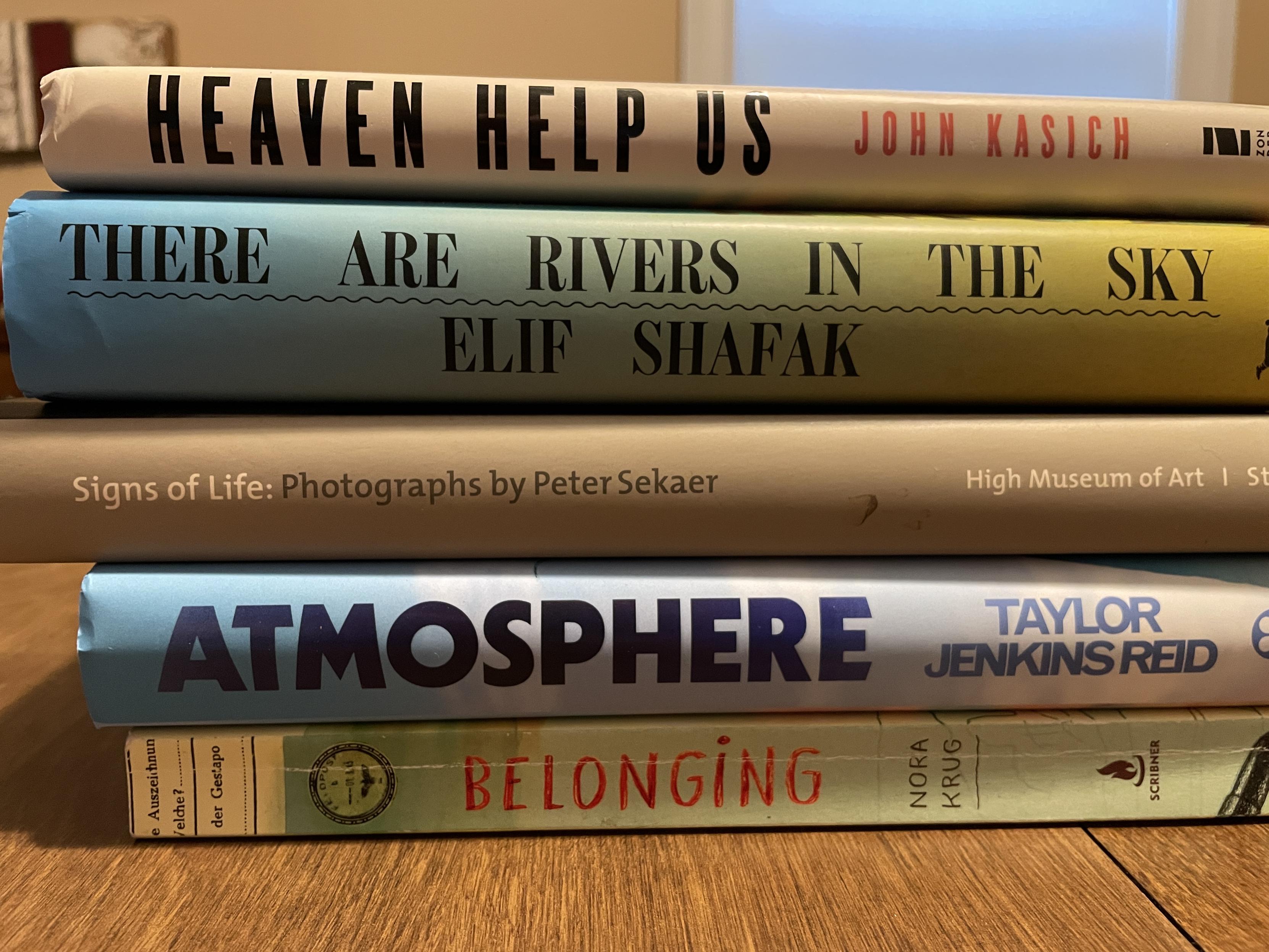 Books in pile for Book Spine Poetry: Heaven Help Us There Are Rivers In The Sky Signs Of Life Atmosphere Belonging