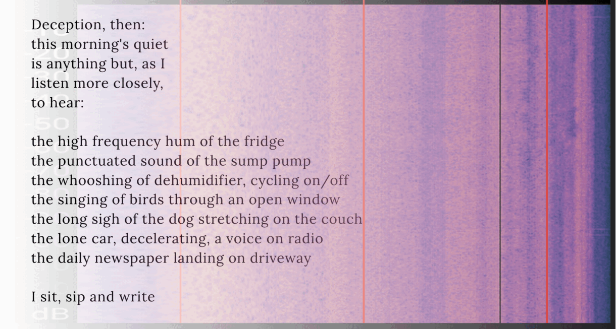 Poem with some audio frequency imagery artwork filtered behind the words: Deception, then: this morning's quiet is anything but, as I listen more closely, to hear: the high frequency hum of the fridge the punctuated sound of the sump pump the whooshing of dehumidifier, cycling on/off the singing of birds through an open window the long sigh of the dog stretching on the couch the lone car, decelerating, a voice on radio the daily newspaper landing on driveway I sit, sip and write