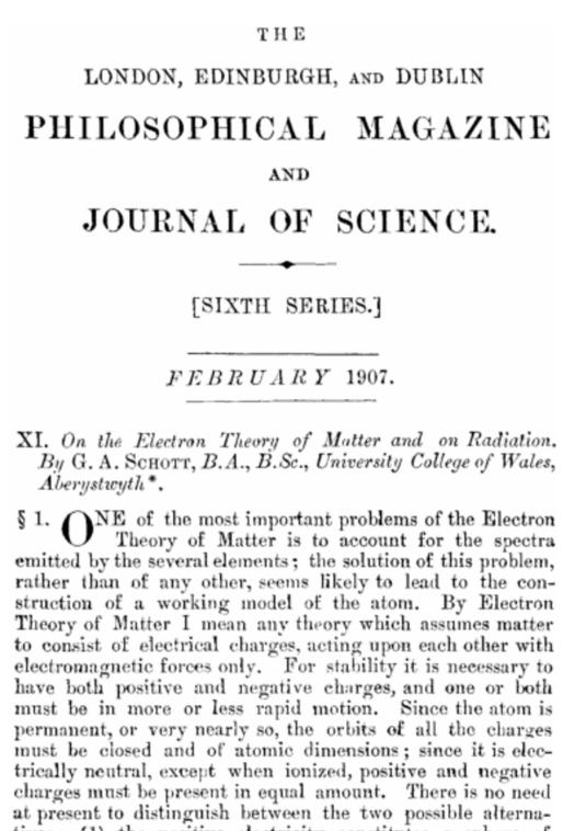 The front page of the "London, Edinburgh and Dublin Philosophical Magazine and Journal of Science" dated February 1907. The page shows a scientific article by G.A. Schott titled "On the electron theory of matter and on radiation". The articles begins with the following words: "One of the most important problems of the Electron Theory of Matter is to account for the spectra emitted by the several elements; the solution of this problem, rather than of any other, seems likely to lead to the construction of a working model of the atom."