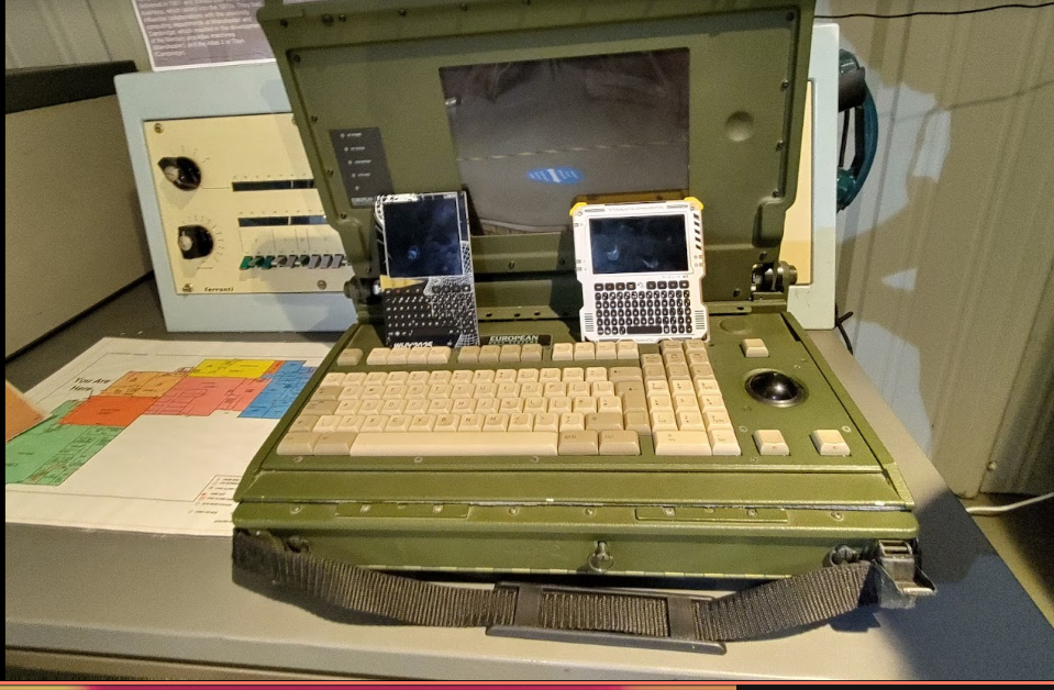 The WHY badge and the Tanmatsu / Konsool badge, sat on an absolutely ginormous (that is a technical term) "luggable" laptop that looks to be designed for battlefield conditions. They look absolutely tiny.