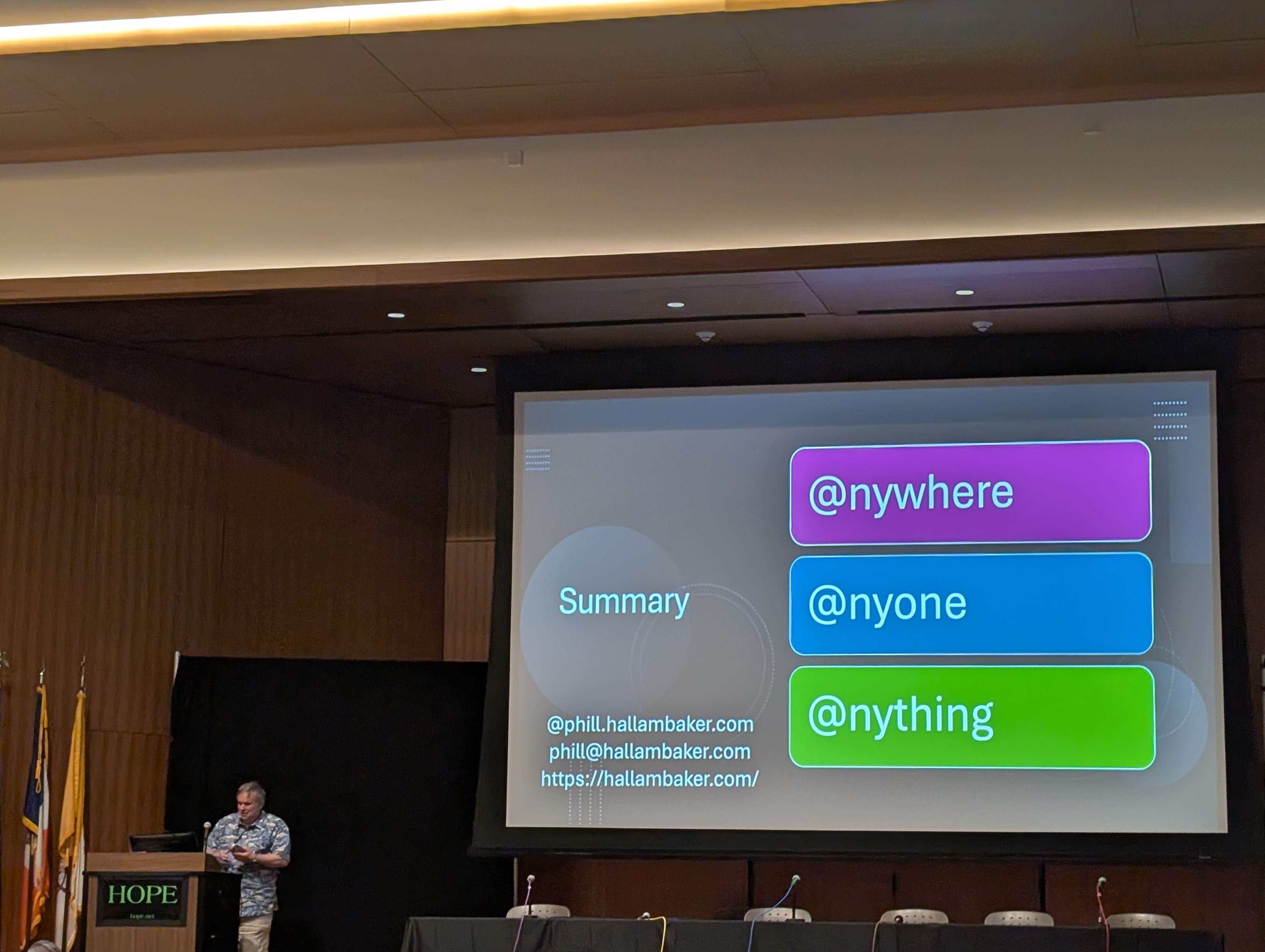 Evan Prodromou @evan@cosocial.ca replied · activity timestamp 2 months ago @hallam Read more Read less alt Phillip Hallam-Baker on stage. Phillip Hallam-Baker on stage. Reply Boost Quote (pending approval) Like More actions Copy link Flag this comment Block