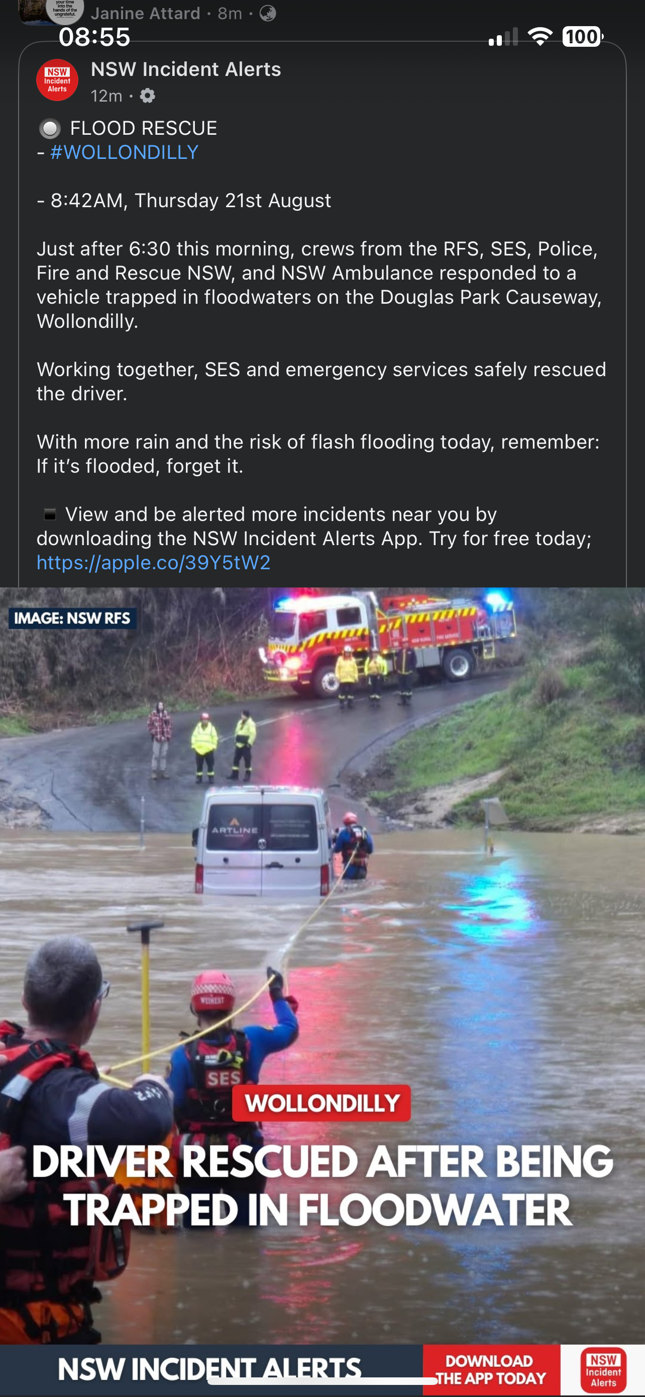 Matt H @MattHatton@aus.social replied · activity timestamp 5 months ago THAT’S THE SPIRIT!(Granted this is not Audley Weir, but it is Audley Weir’s home brand cousin) Read more Read less Translate alt Van sitting in the middle of Douglas Park Causeway, which is very flooded. SES personnel are conducting a rescue operation. Van sitting in the middle of Douglas Park Causeway, which is very flooded. SES personnel are conducting a rescue operation. Reply Boost Quote pending approval Like More actions Copy link Flag this comment Block