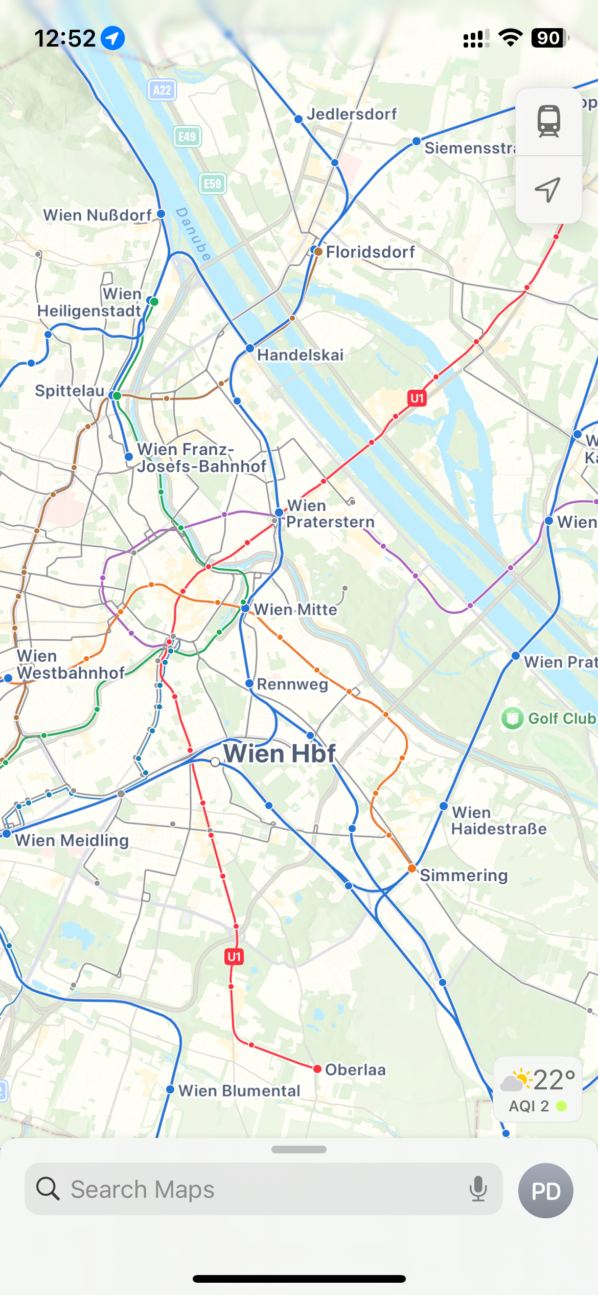 A screenshot of Apple Maps on an iPhone running iOS 18. The view mode is set to public transport and centred slightly west of central Vienna, so that Wien Hbf, Rennweg, and Wien Mitte are most prominent. Everything seems to be displayed as expected, there are no visual glitches on the labels.