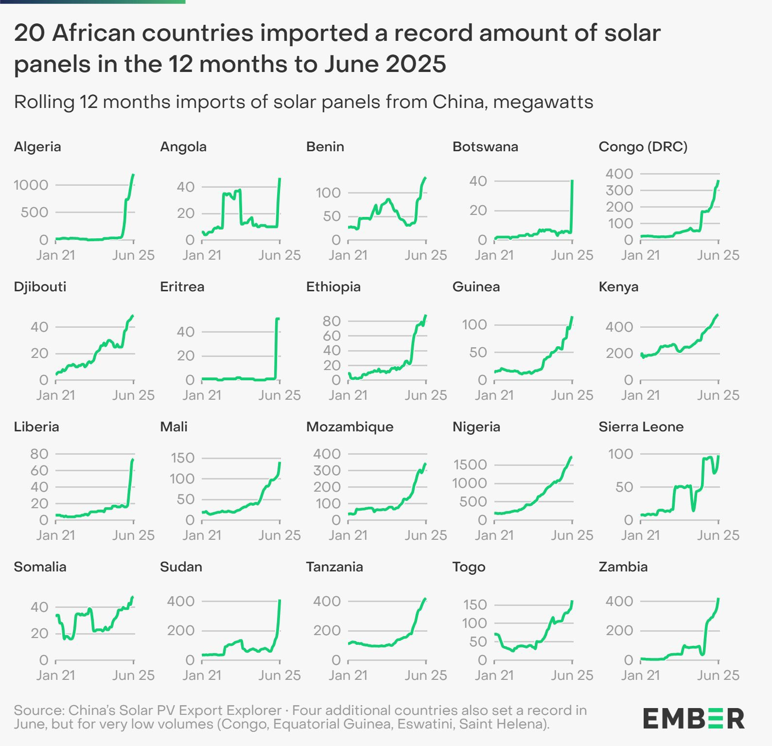 Africa’s clean energy dawn is here. ☀️ In the past 12 months, solar panel imports soared 60%, with 20 countries setting records—from Nigeria & Kenya to Algeria, Tanzania & Zambia. A rising Sun lifts all humans, and Africa is joining the global surge toward a solar-powered future. 🌍🔋 #EnergyTransition
