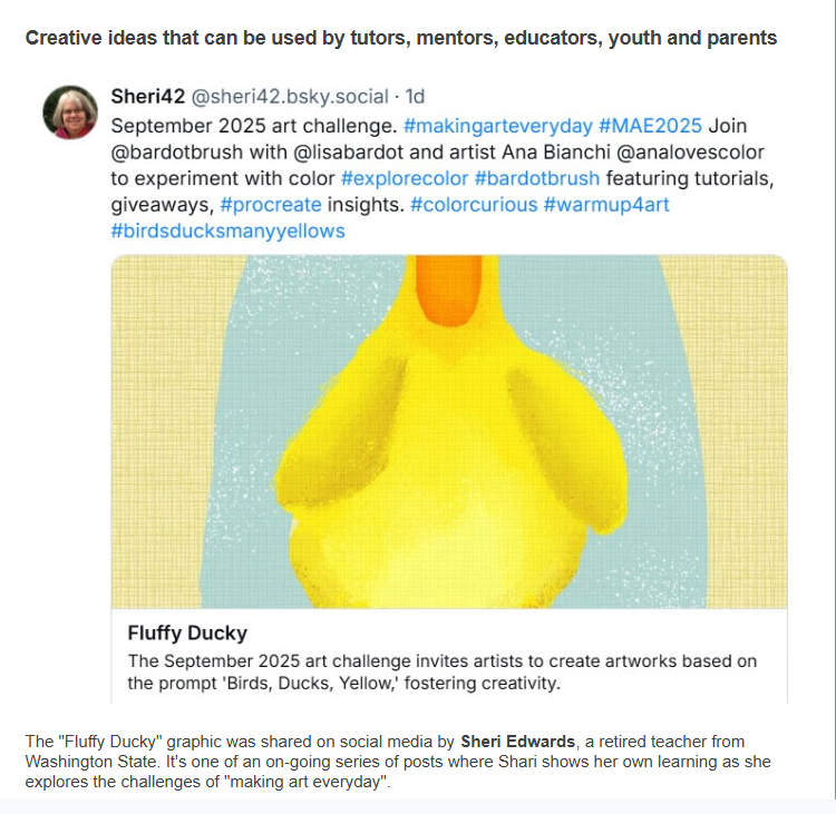 In my monthly newsletter I pointed to a blog by #clmooc member @sheri42.bsky.social & to the DS106 Daily Create. Both share creative activities that could be used in #tutor #mentor & learning programs, as well as in schools & home. See the newsletter at tutormentorexchange.net/2025-newslet...