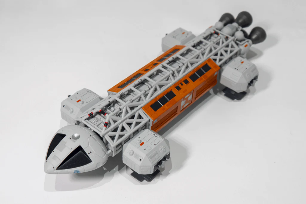A diecast toy version of the Eagle Transporter spacecraft with an orange container suspended midsection
