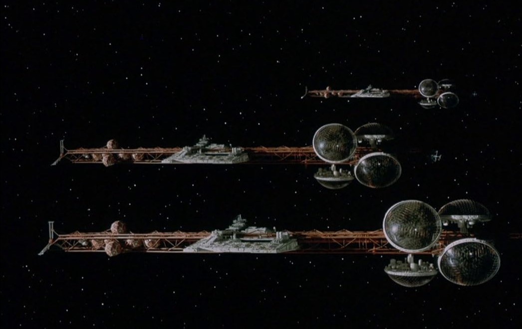 Still from the film Silent RUnning showing the Valley Forge craft, a long scaffolded red and white craft with biodomes