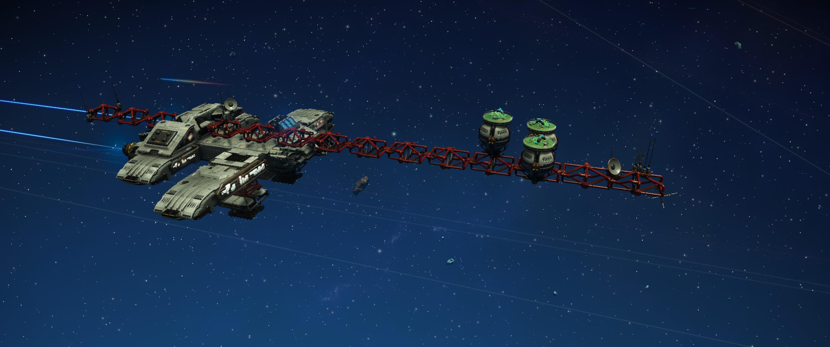 A very poor facsimile of the Valley Forge craft from Silent Running as a video game screenshot from the No Man's Sky game; it is a long thin red scaffold aft to stern, white crew and cargo areas midship, and three biodome-ish effects toward to the fore.