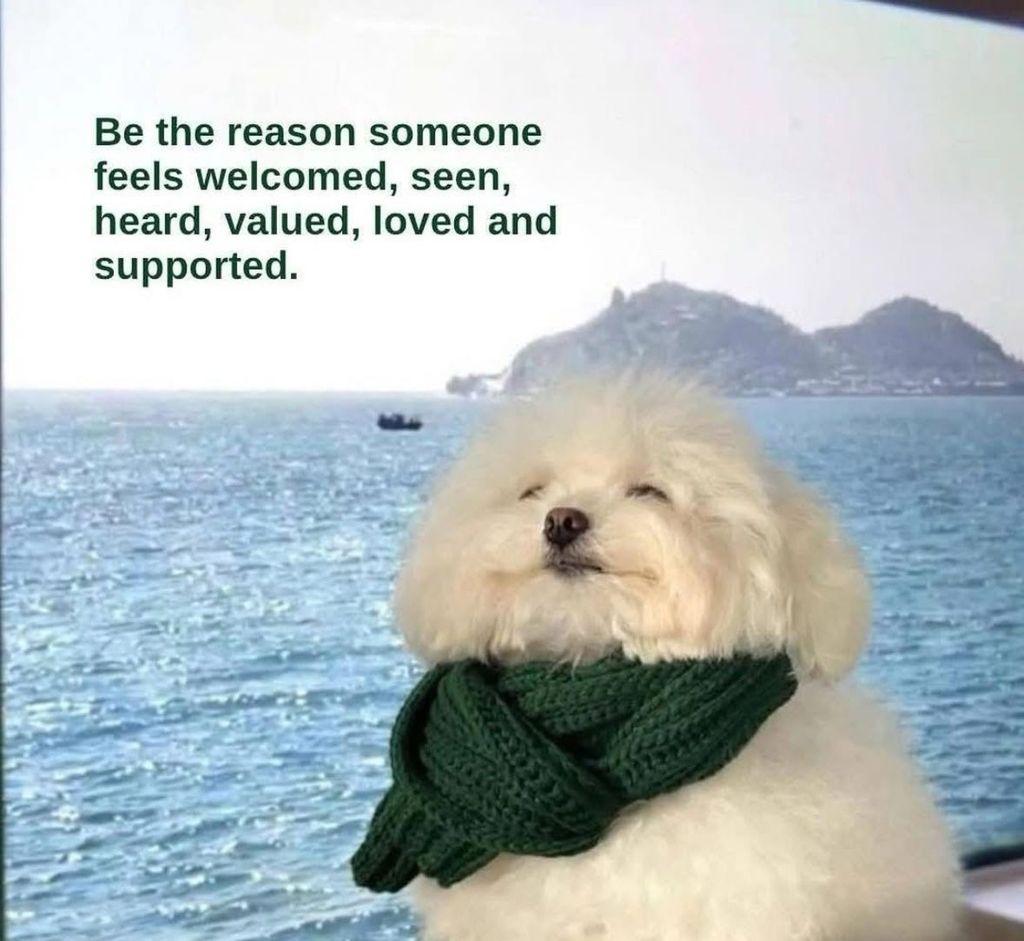 A fluffy white dog with a content, smiling expression and closed eyes, wearing a chunky, dark green knitted scarf. The dog is sitting in front of a window with a view of a calm blue sea and a distant, hilly shoreline. In the upper left corner, text reads: "Be the reason someone feels welcomed, seen, heard, valued, loved and supported."