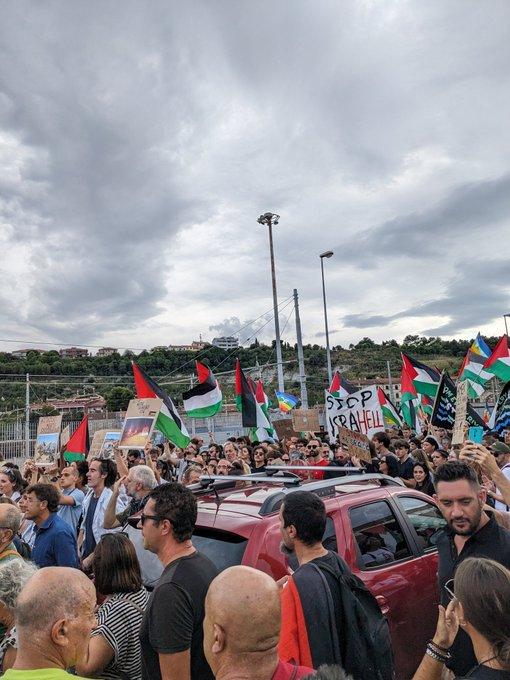 Large crowd with flags and banners surround pictures of murdered Palestinians laid on the ground in the piazza in Aosta as part of the general strike in Italy