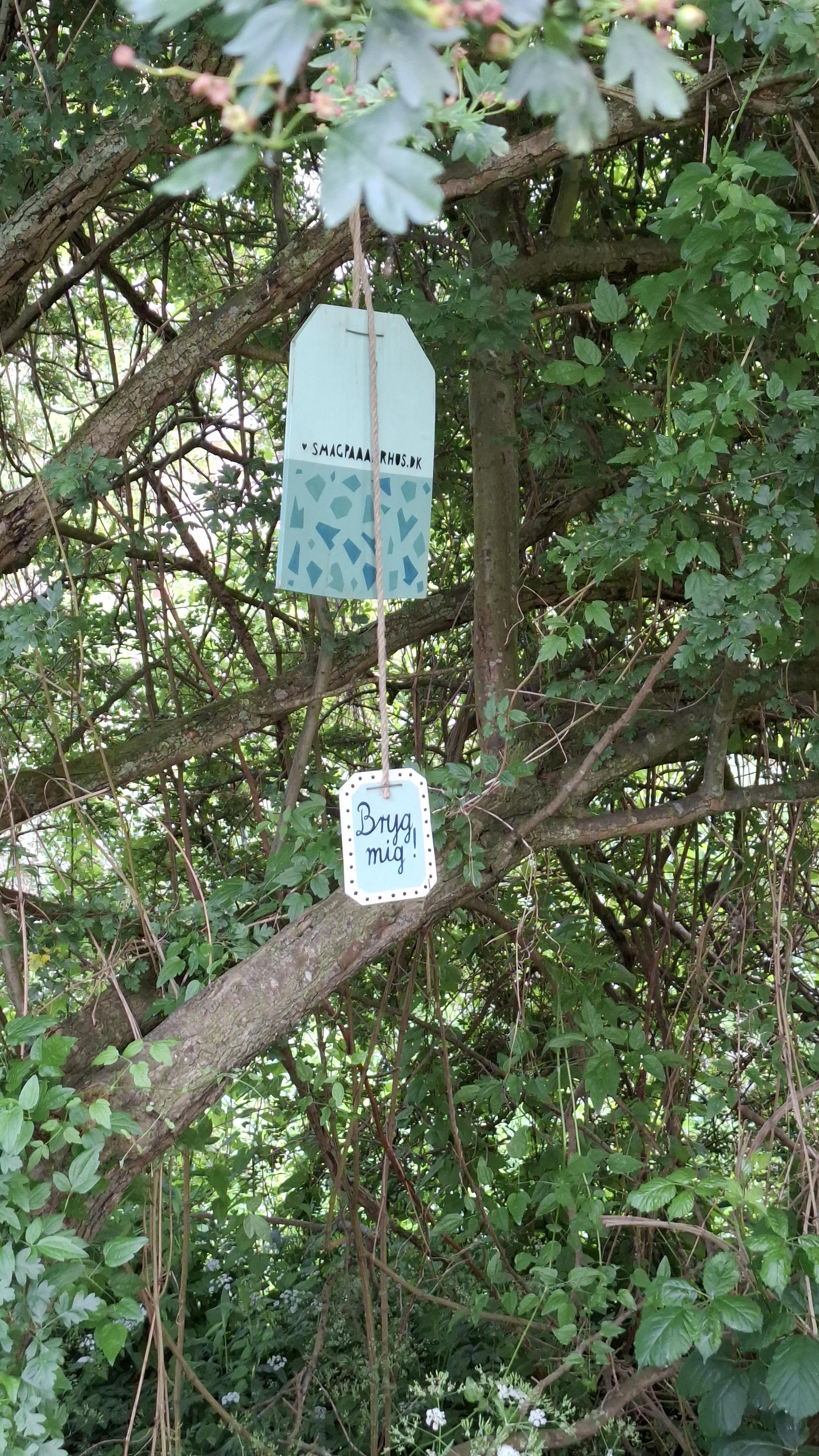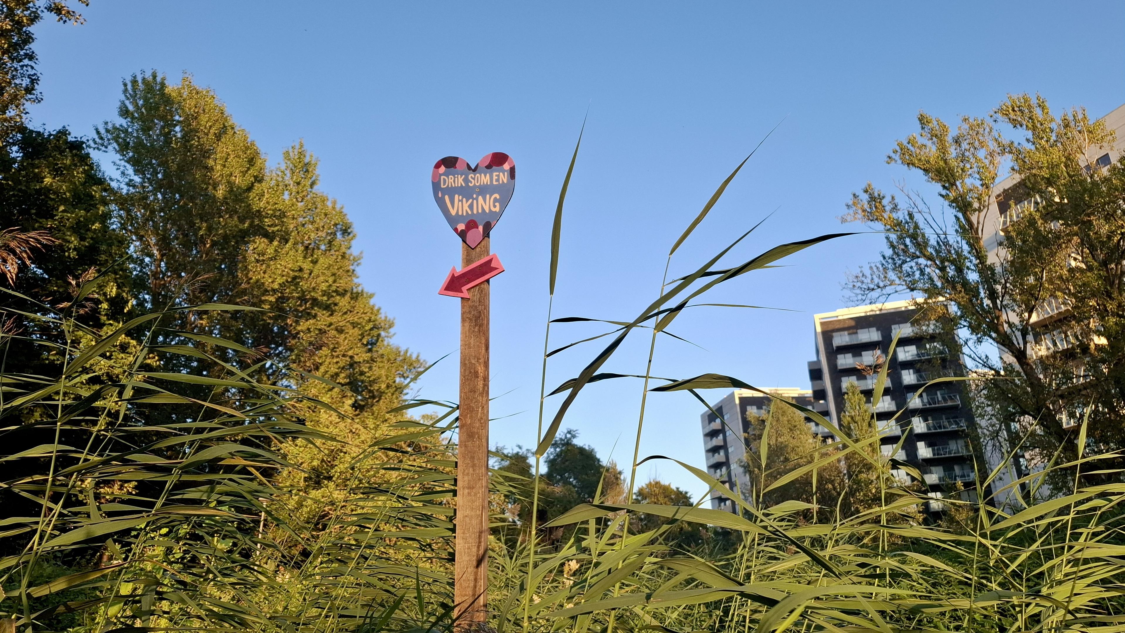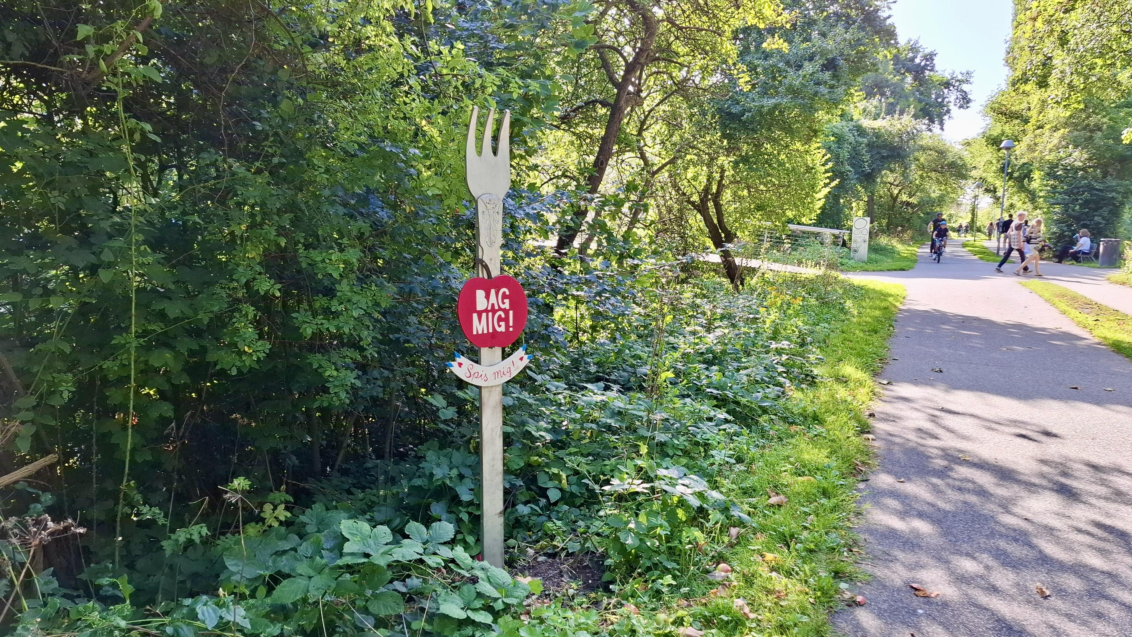 Short description: a pretty wooden signpost by bushes and trees. Fuller description: The river path and bike route, people walking in the distance. To the right, among the trees and bushes, an eye-catching, pretty, colourful old-style wooden board headed ‘Indtag Brabandstien'. 'Take The Brabrand Route'. Other signs hang on it, including one shaped like a shield with lots of text. It explains the 1241 law and gives info about the signposting of wild edibles all over the city. A litte sign is shaped like a jam pot with a label that says 'pickle me’. There is a pretty wooden red box like an old style letter box. It has printed brochures about what you can find, where. It references the website with full info including recipes - https://smagpaaaarhus.dk