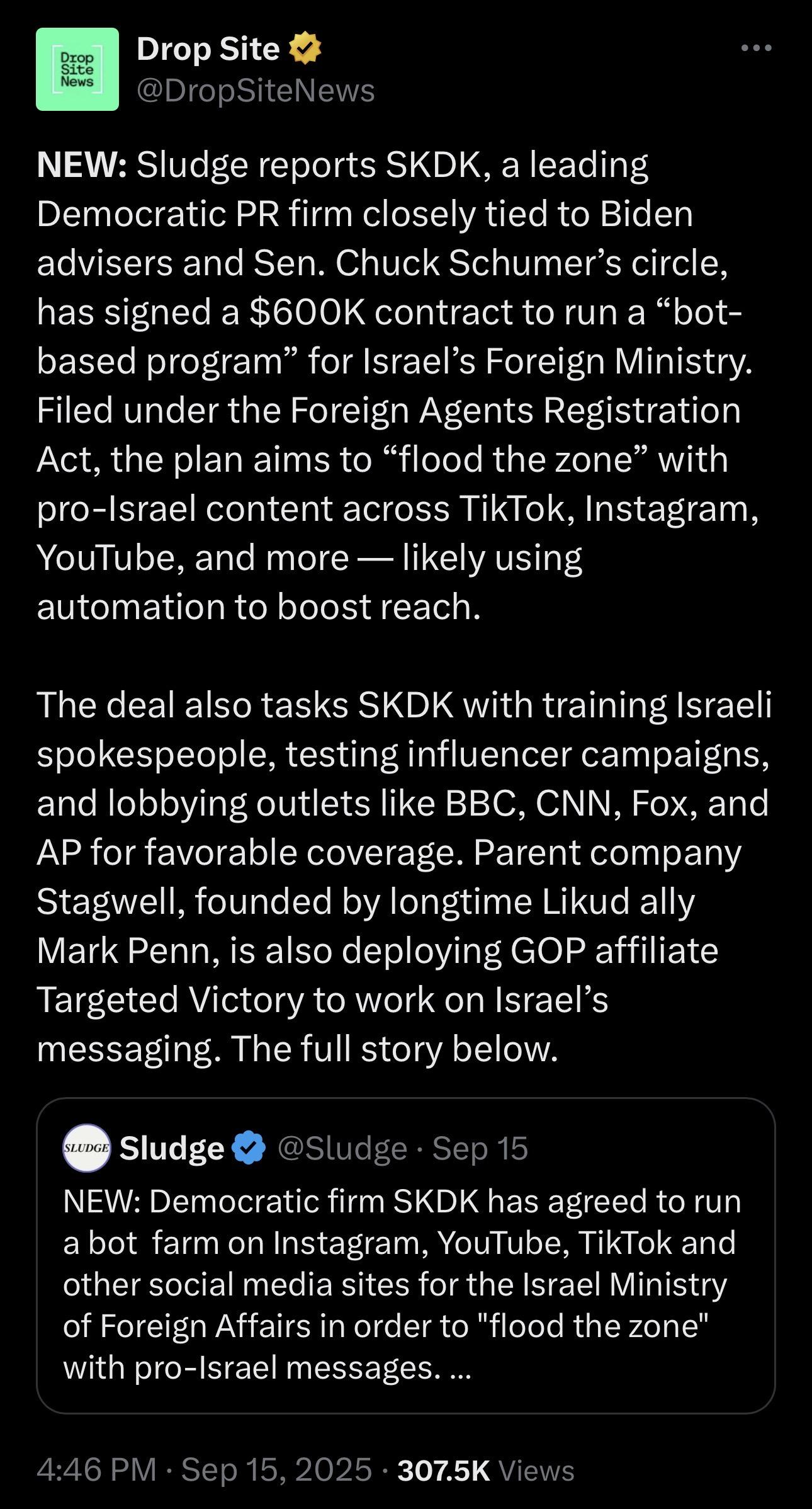 Sludge reports SKDK, a leading Democratic PR firm closely tied to Biden advisers and Sen. Chuck Schumer’s circle, has signed a $600K contract to run a “bot-based program” for Israel’s Foreign Ministry. Filed under the Foreign Agents Registration Act, the plan aims to “flood the zone” with pro-Israel content across TikTok, Instagram, YouTube, and more — likely using automation to boost reach.