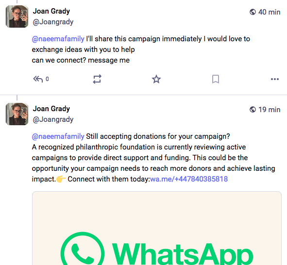 an account called Joan Grady sending a comment about the campaign: "I'll share this campaign immediately I would love to exchange ideas with you to help can we connect? message me" and then: "Still accepting donations for your campaign? A recognized philanthropic foundation is currently reviewing active campaigns to provide direct support and funding. This could be the opportunity your campaign needs to reach more donors and achieve lasting impact.👉 Connect with them today:https://wa.me/+447840385818"