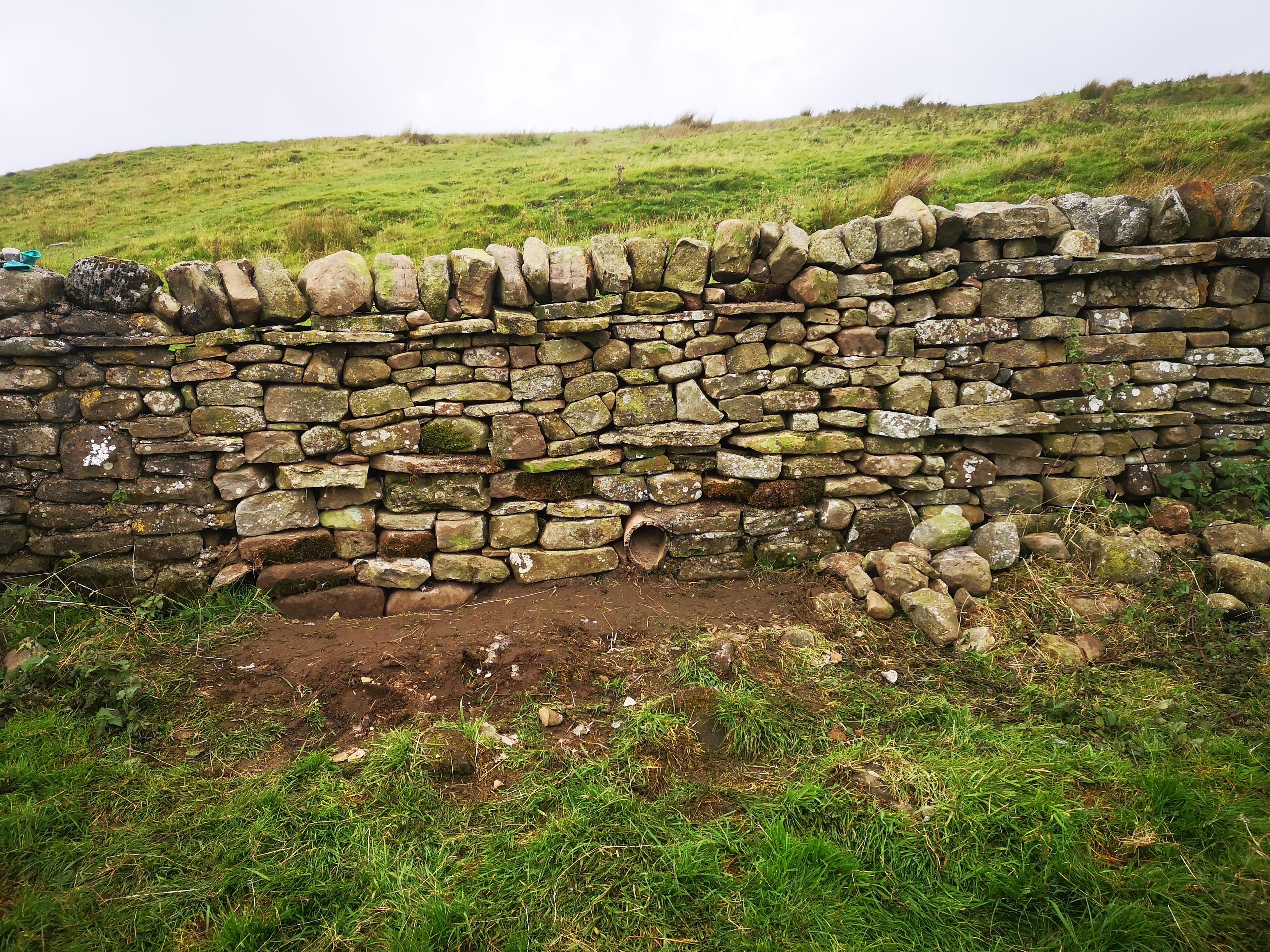 A dry stone wall is being repaired and runs at an angle from right to left with some stones on the ground still to go on. Right against the wall and same height as the wall, looking towards me, is a young donkey. It's mainly off white colour but piebald with patches of brown. The land rises behind the wall and there is a farm shed extreme left.