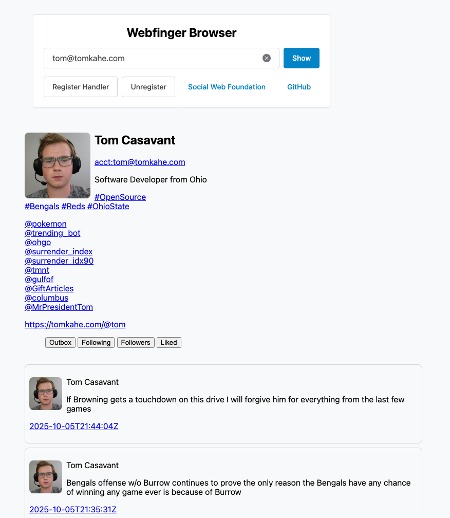 A screenshot of the Webfinger Browser client build by the Social Web group, showing a AP Actor's profile and outbox.