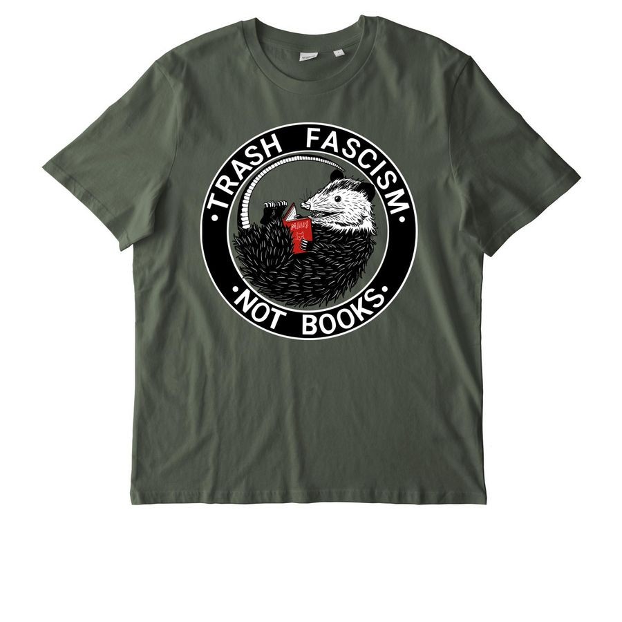 Greenish grayish T-shirt with a picture of a possum reading a book. A circle around the possum contains text that says, "Trash fascism, not books"
