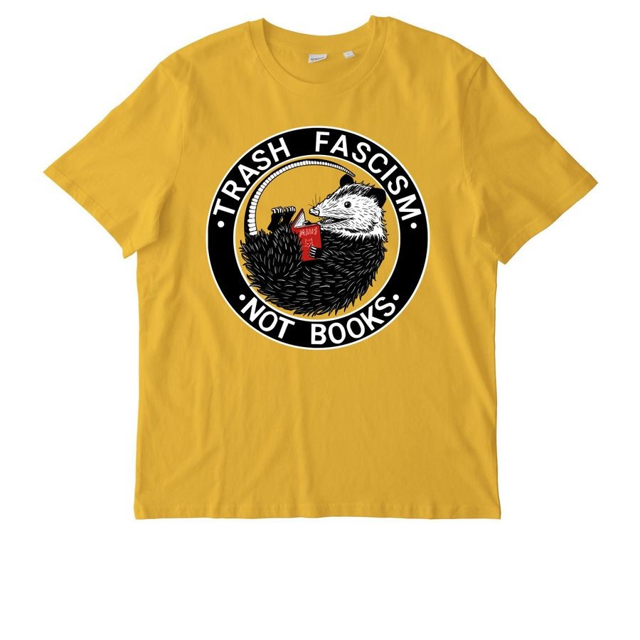 Yellow T-shirt with a picture of a possum reading a book. A circle around the possum contains text that says, "Trash fascism, not books"