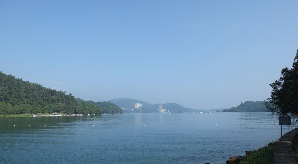 Das Foto zeigt eine idyllische Landschaft mit einem See, der in sanftem Morgenlicht liegt. Links im Vordergrund steht ein großer Baum, durch dessen Äste die Sonne strahlt und goldene Lichtstrahlen über das Wasser wirft. Am Ufer liegen zahlreiche Boote und kleine Schiffe vertäut, einige davon mit bunten Flaggen. Im Hintergrund erheben sich grüne Hügel und Berge, die von Nebelschwaden und leichtem Dunst umgeben sind. Der Himmel ist klar, nur wenige Wolken schweben über der Szene, was dem Bild eine friedliche und harmonische Atmosphäre verleiht. Es wirkt wie ein Moment kurz nach Sonnenaufgang an einem ruhigen Seeufer.