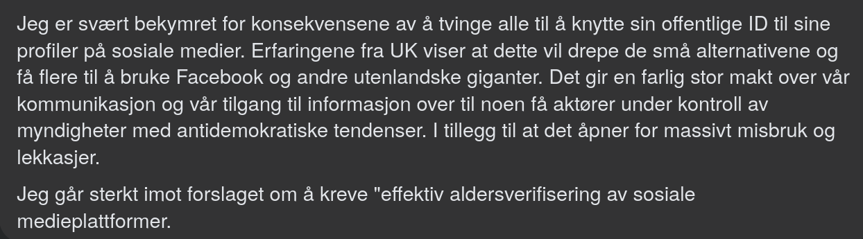 Hva er målet vårt med lovene og samfunnet som vi skaper sammen? Hvordan møter vi utviklingen vi ser rundt oss, med stadig mer maktkonsentrasjon på stadig færre hender – i hovedsak hos bedrifter underlagt autoritære regimer i USA og Kina – en dreining mot ytre høyre i hele verden, og stadig mer lekkasjer og hacking av privat informasjon, som fører til store problemer for folk? Skal den norske stat møte dette med å bidra til enda mer maktkonsentrasjon over hvor vi får informasjonen vår fra og hvor vi kommuniserer med venner; hindre små, norske aktører i å etablere alternativer; og tvinge folk til å oppgi enda mer privat informasjon, som kan lekke og utnyttes? Hvor fører denne veien hen til slutt? Når vi kombinerer det med masseovervåking, forbud mot kryptering som er på vei gjennom EUs chat controll, et stadig mer agressivt Russland og autoritært USA, osv? Ser vi ikke at vi går i feil retning? At forsøk på tekniske løsninger på alle våre utfordringer bare fører til mer alvorlige problemer? At vi må ta ansvar for å skape et bedre samfunn, hvor barn ikke føler behov for å mobbe, hvor folk ikke føler en slik håpløshet at de lar seg lokke ut i ekstremisme?