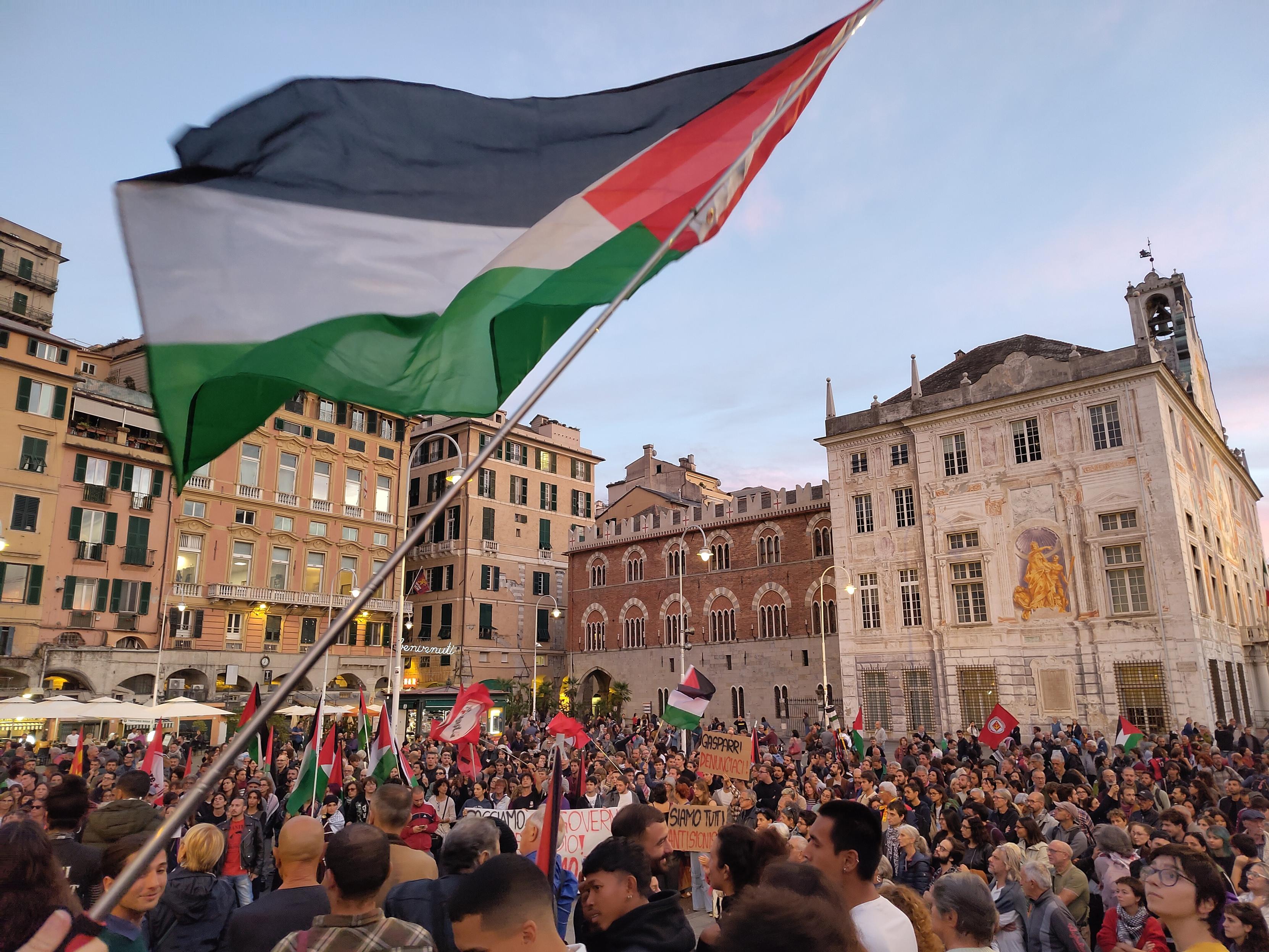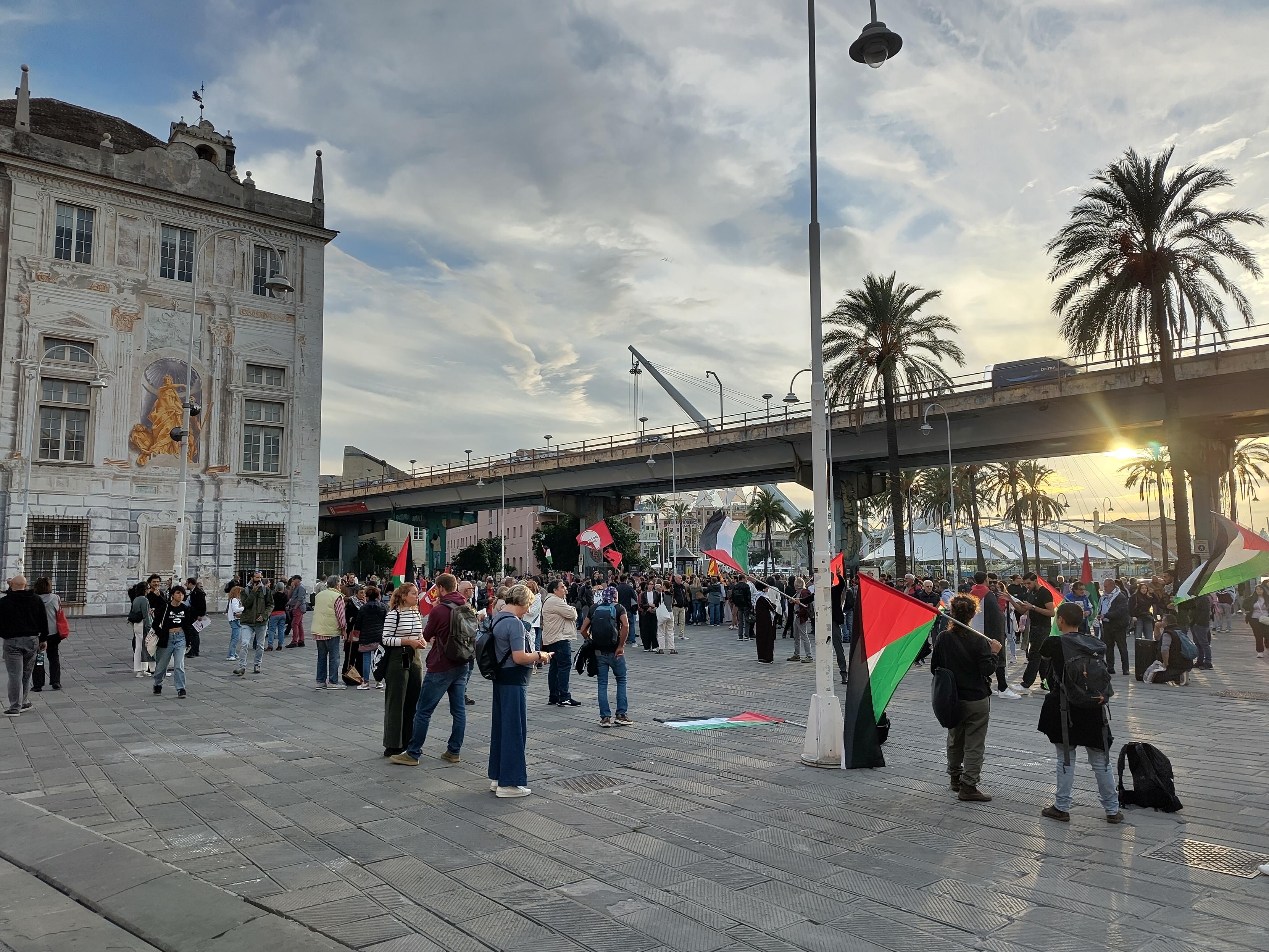 alt Foto di piazza Caricamento gremita di persone, l'ora del crepuscolo rende il cielo rosato e dietro la folla si vede la doppia sagoma di Palazzo San Giorgio e del Palazzo del Capitano (quello dove Marco Polo prigioniero ha scritto "Il Milione"). In primissimo piano una bandiera palestinese che sventola fotografata con notevole fortuna in una posizione felice. Foto di piazza Caricamento gremita di persone, l'ora del crepuscolo rende il cielo rosato e dietro la folla si vede la doppia sagoma di Palazzo San Giorgio e del Palazzo del Capitano (quello dove Marco Polo prigioniero ha scritto "Il Milione"). In primissimo piano una bandiera palestinese che sventola fotografata con notevole fortuna in una posizione felice.
