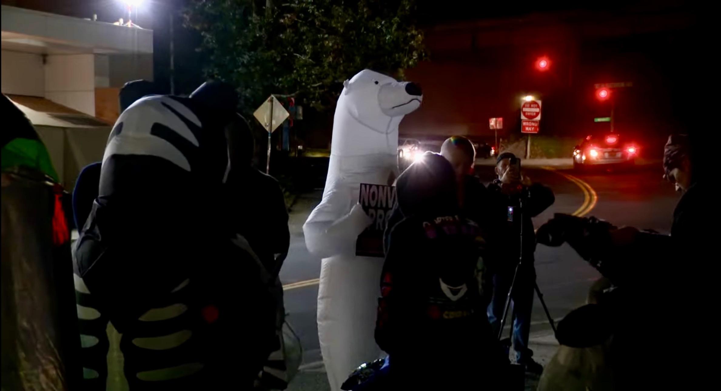 alt A polar bear inflatable costume joins the protest. A polar bear inflatable costume joins the protest.