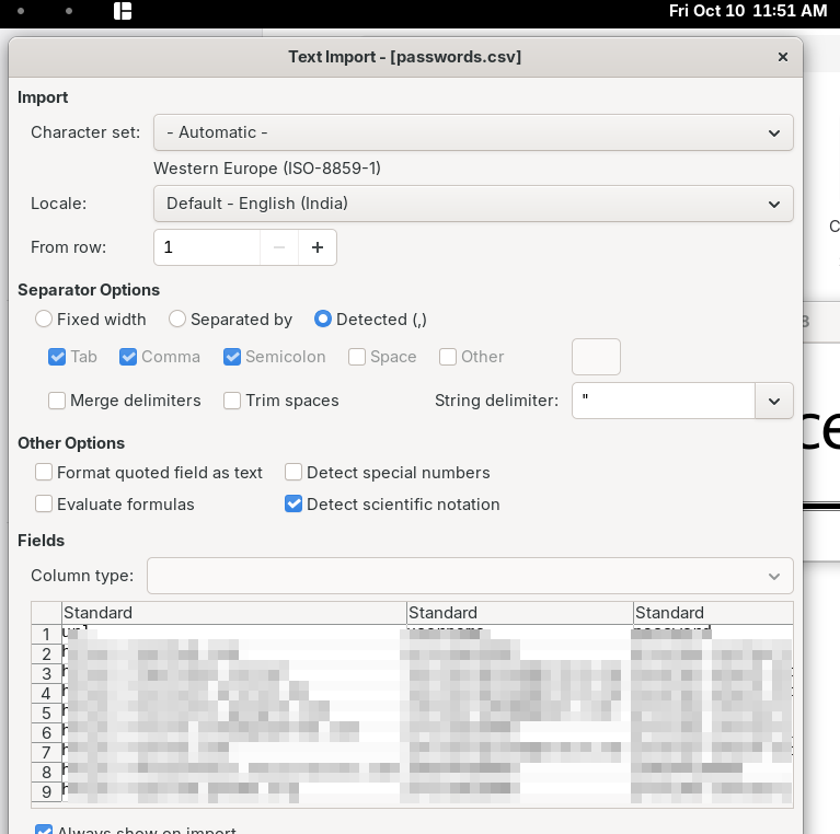 @libreoffice @gnome Yes yes. My bad. I'm running version 25.8.1.1. When I open a .csv file with LibreOffice Calc I see this Text Import window. The problem is that it doesn't fit to my screen size and for that reason the bottom buttons aren't visible.